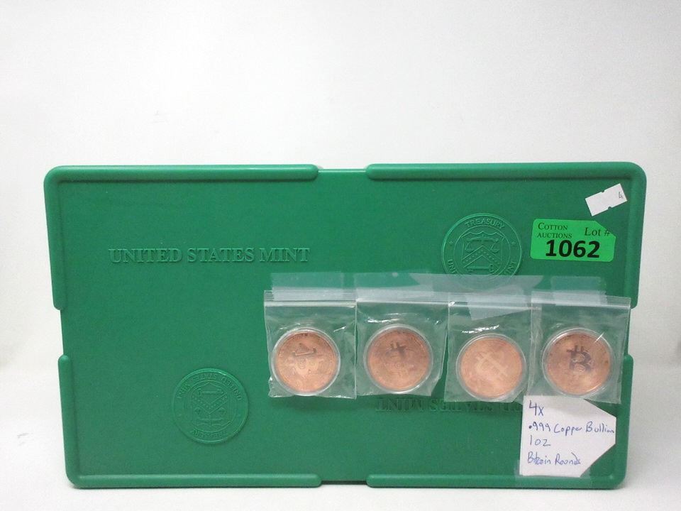 4 Encapsulated Copper Bitcoin commemorative rounds. Mint box measures 9" x 15" x 5" deep.