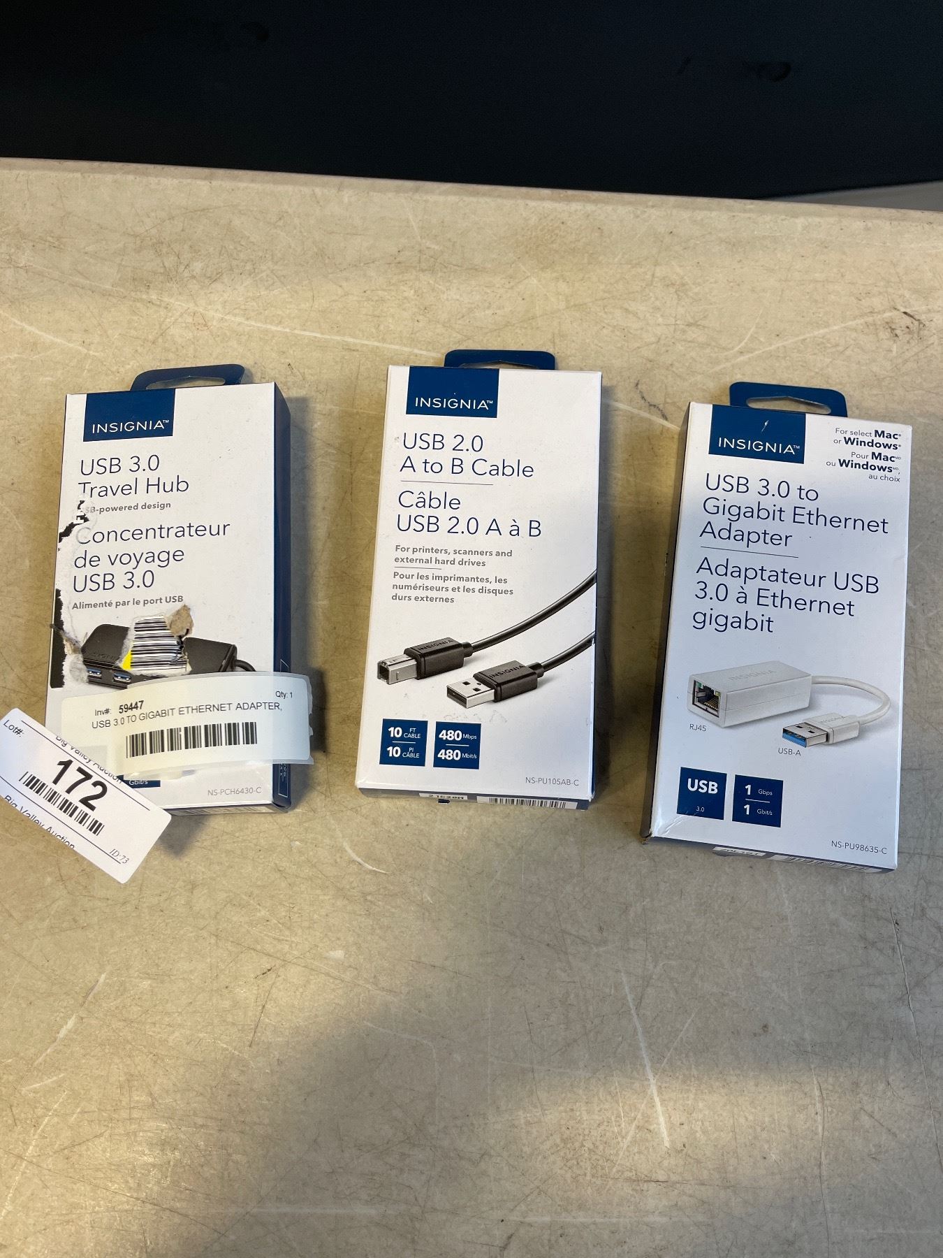 USB 3.0 TO GIGABIT ETHERNET ADAPTER, USB 2.0 A TO B CABLE, AND USB 3.0 TRAVEL ADAPTER