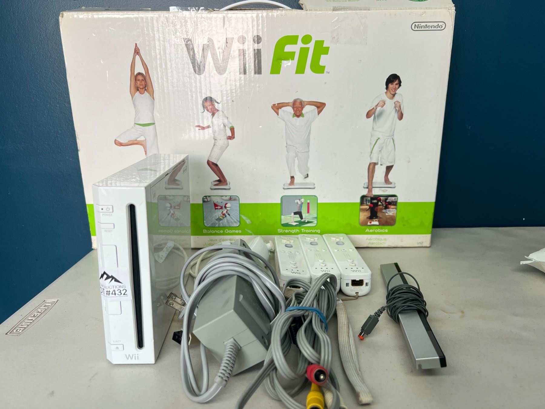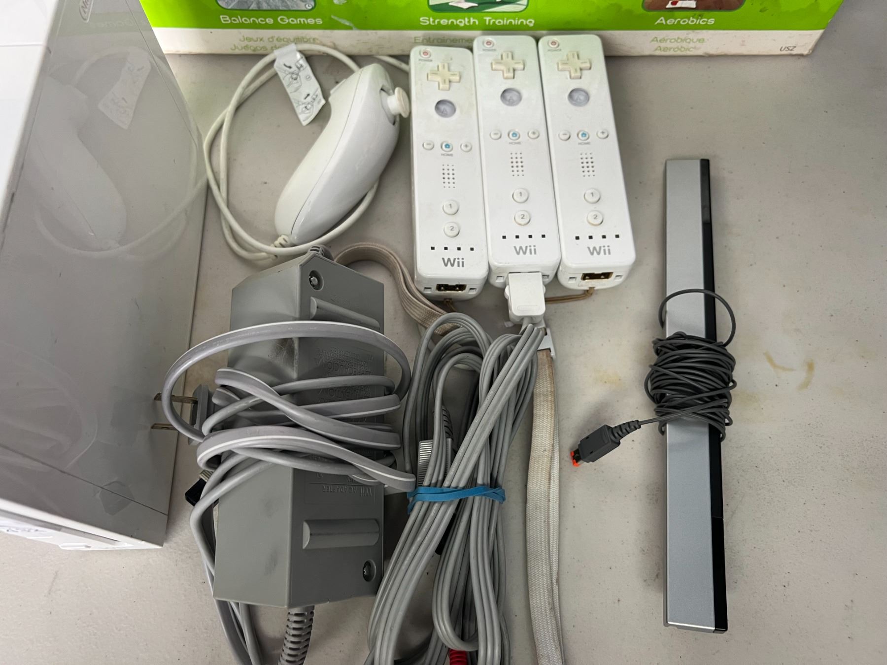 - Includes Wii console, Wii fit board, 3 controllers, 1 nunchuk sensor bar, and cords