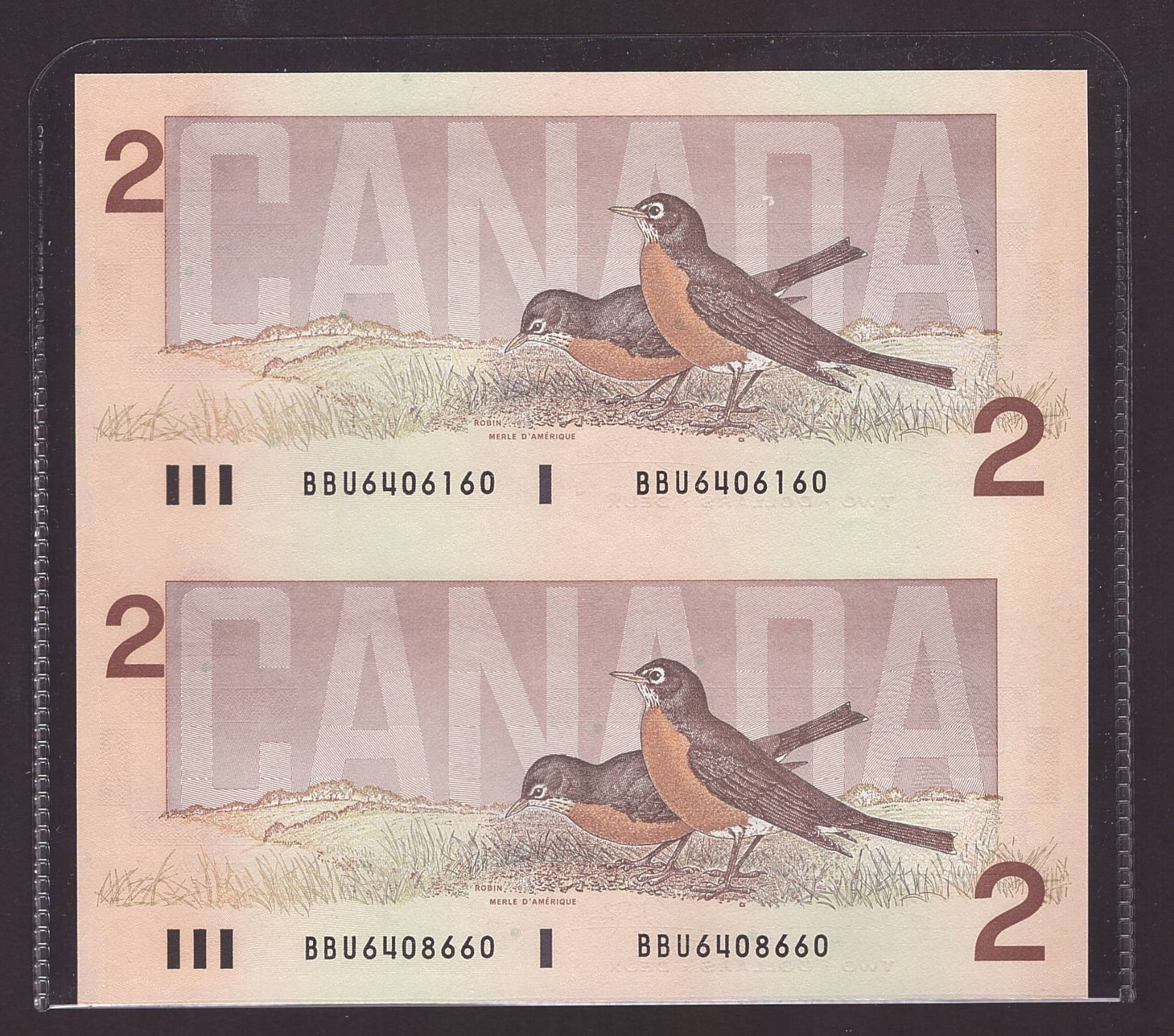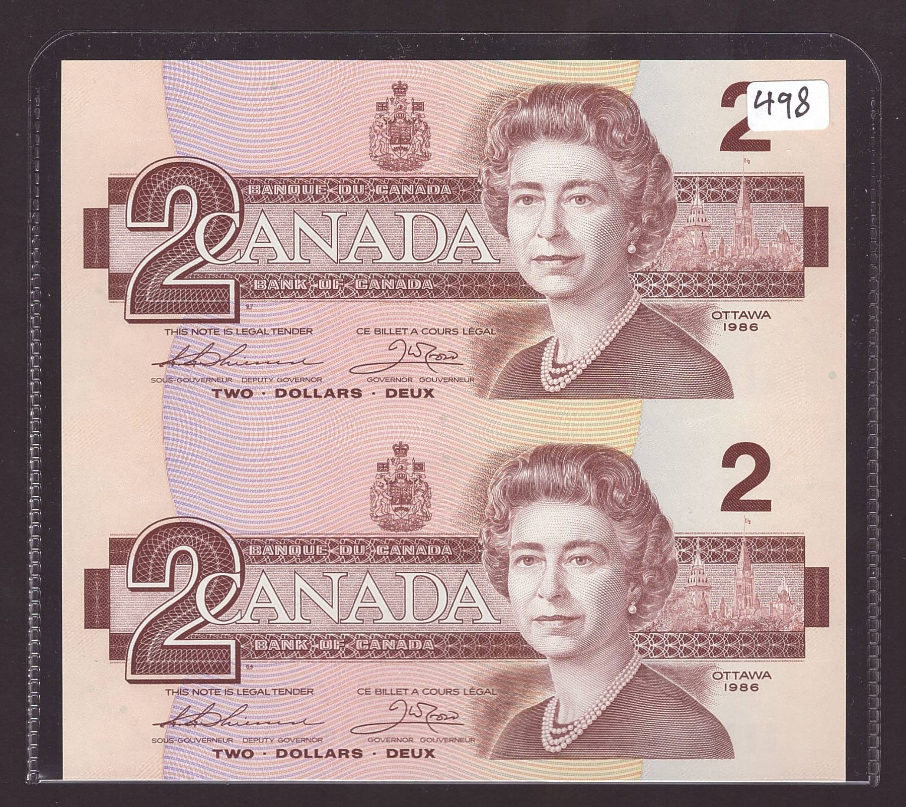 2x uncut Bank of Canada Two Dollar Banknotes from 1986