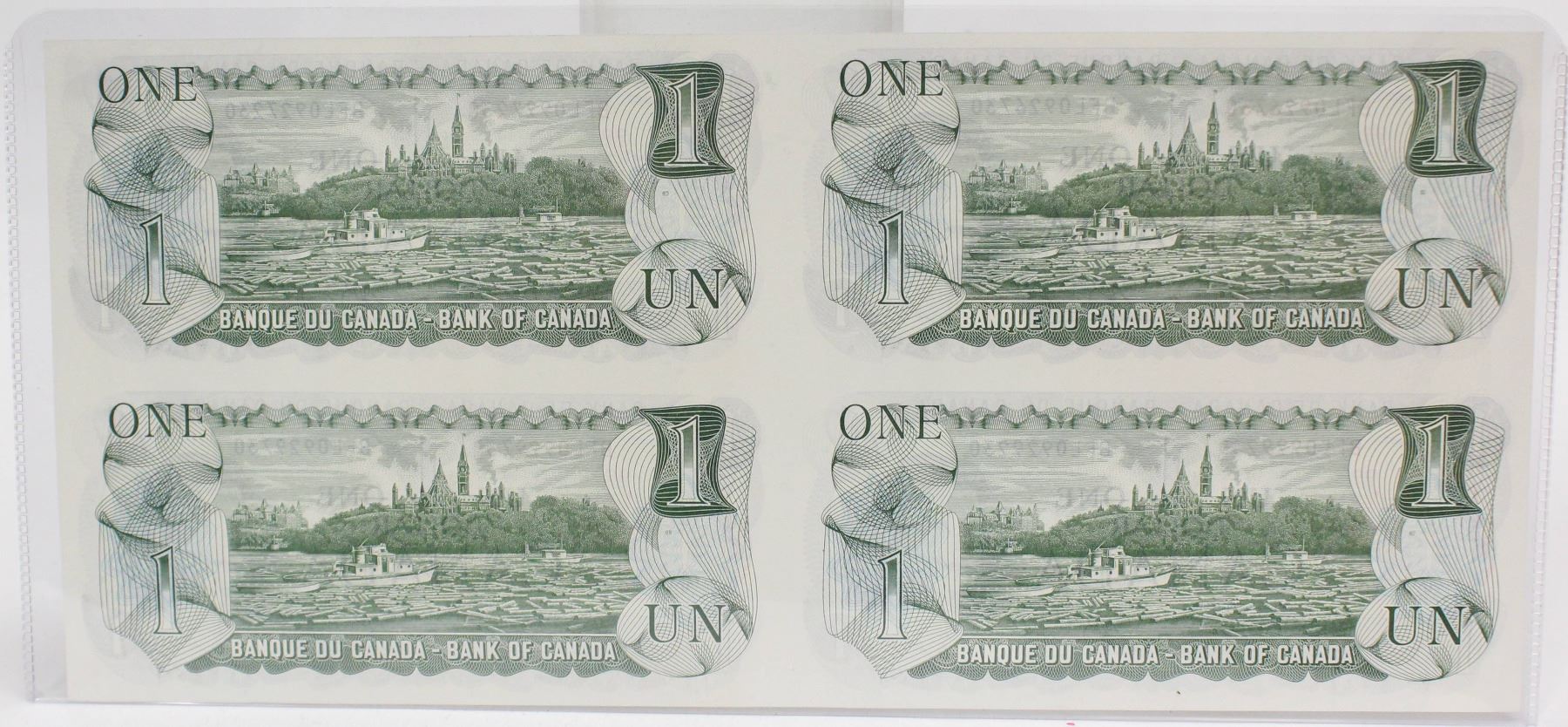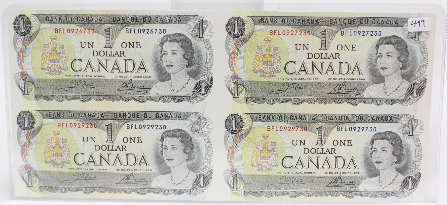 4x uncut Bank of Canada One Dollar Banknotes from 1973