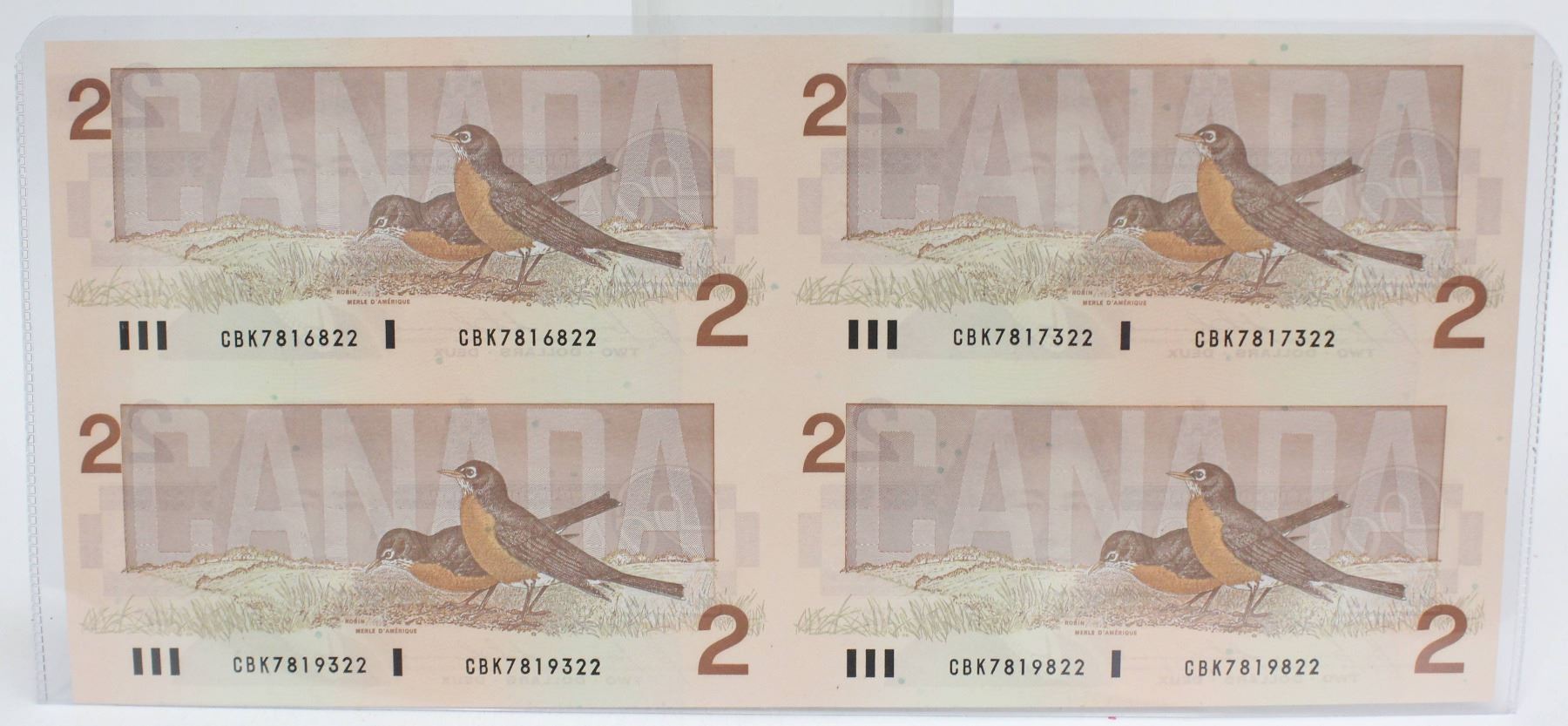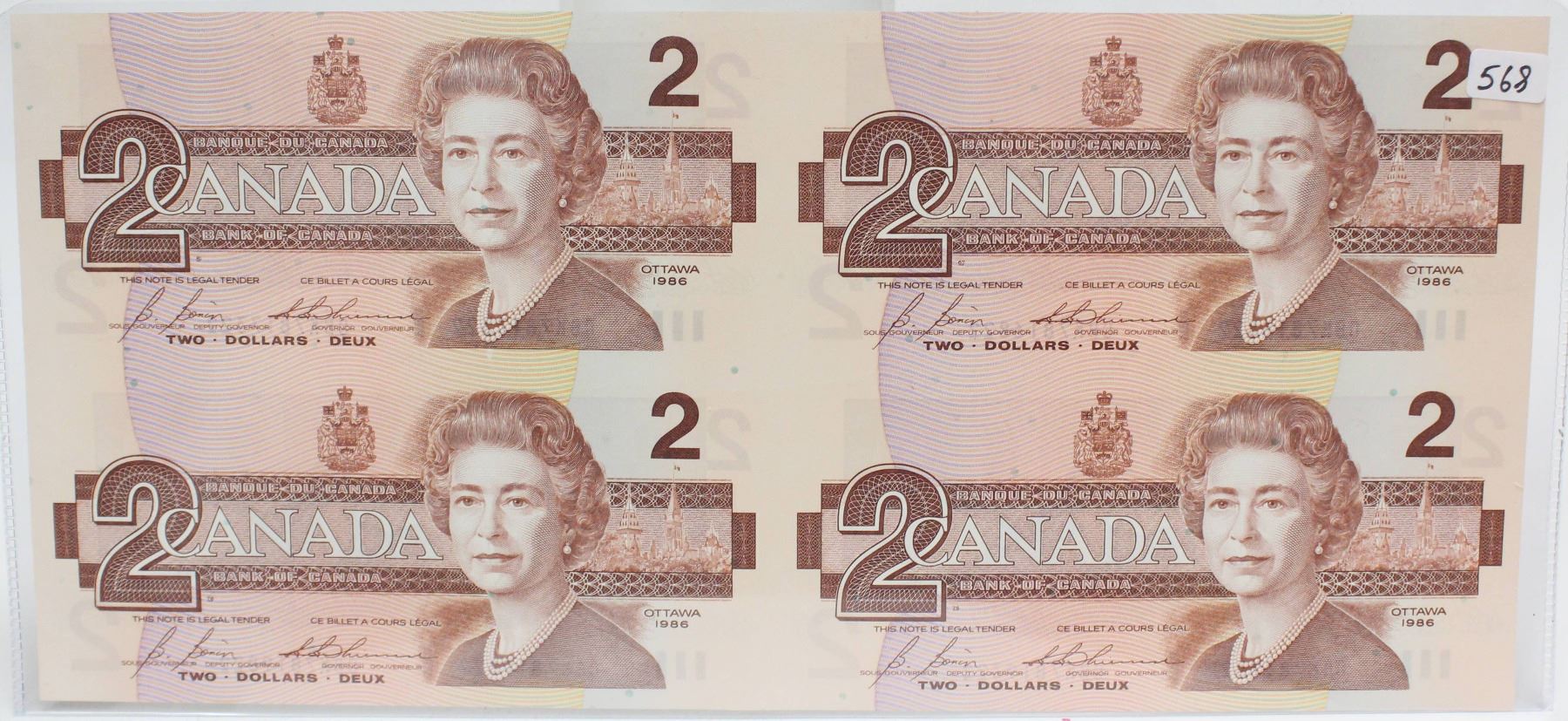 4x uncut Bank of Canada Two Dollar Banknotes from 1986