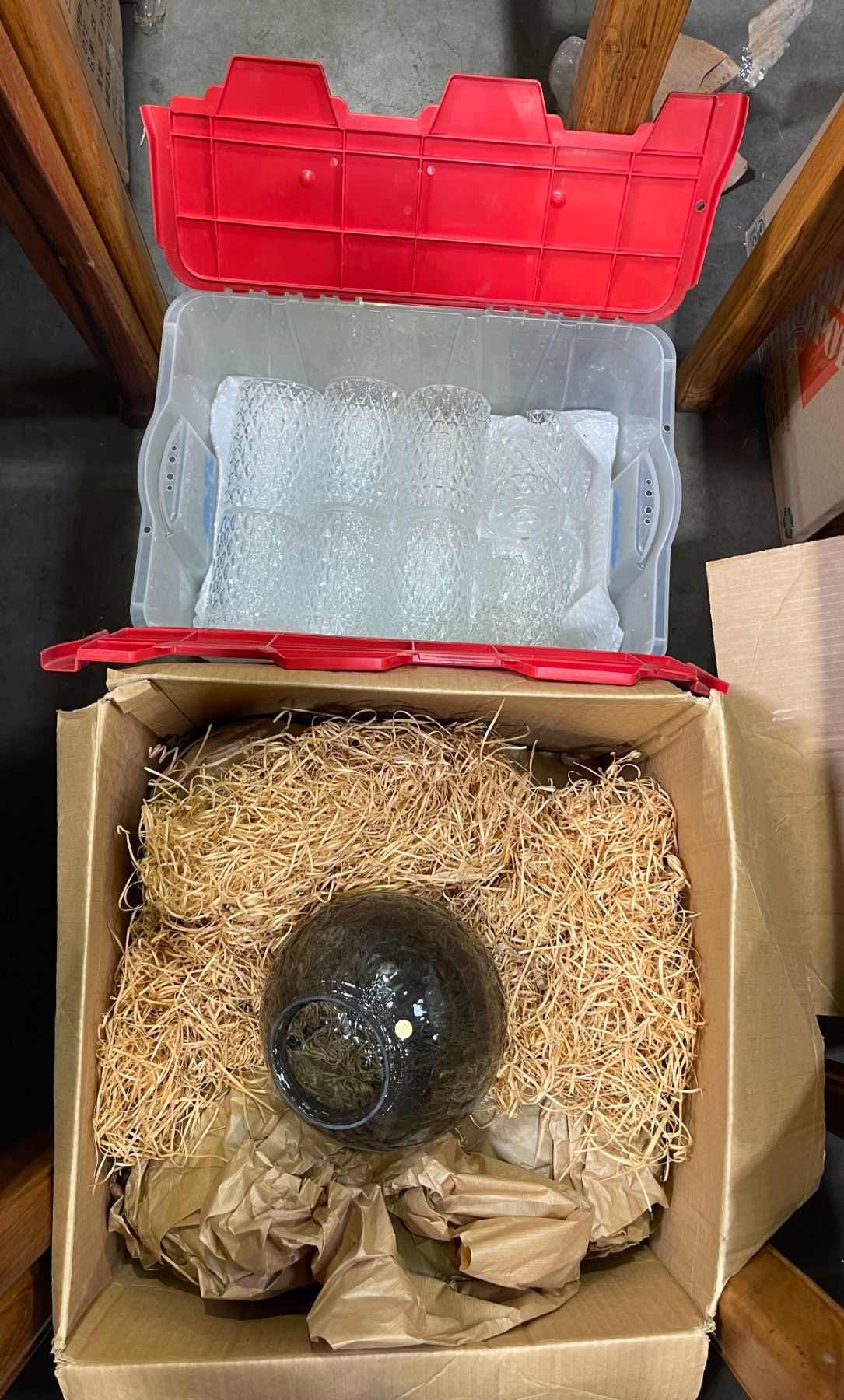 Under Table lot - x3 boxes + x1 plastic bin - Misc vintage glass light fixtures