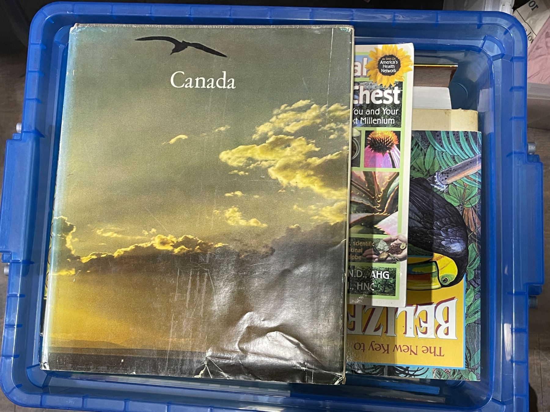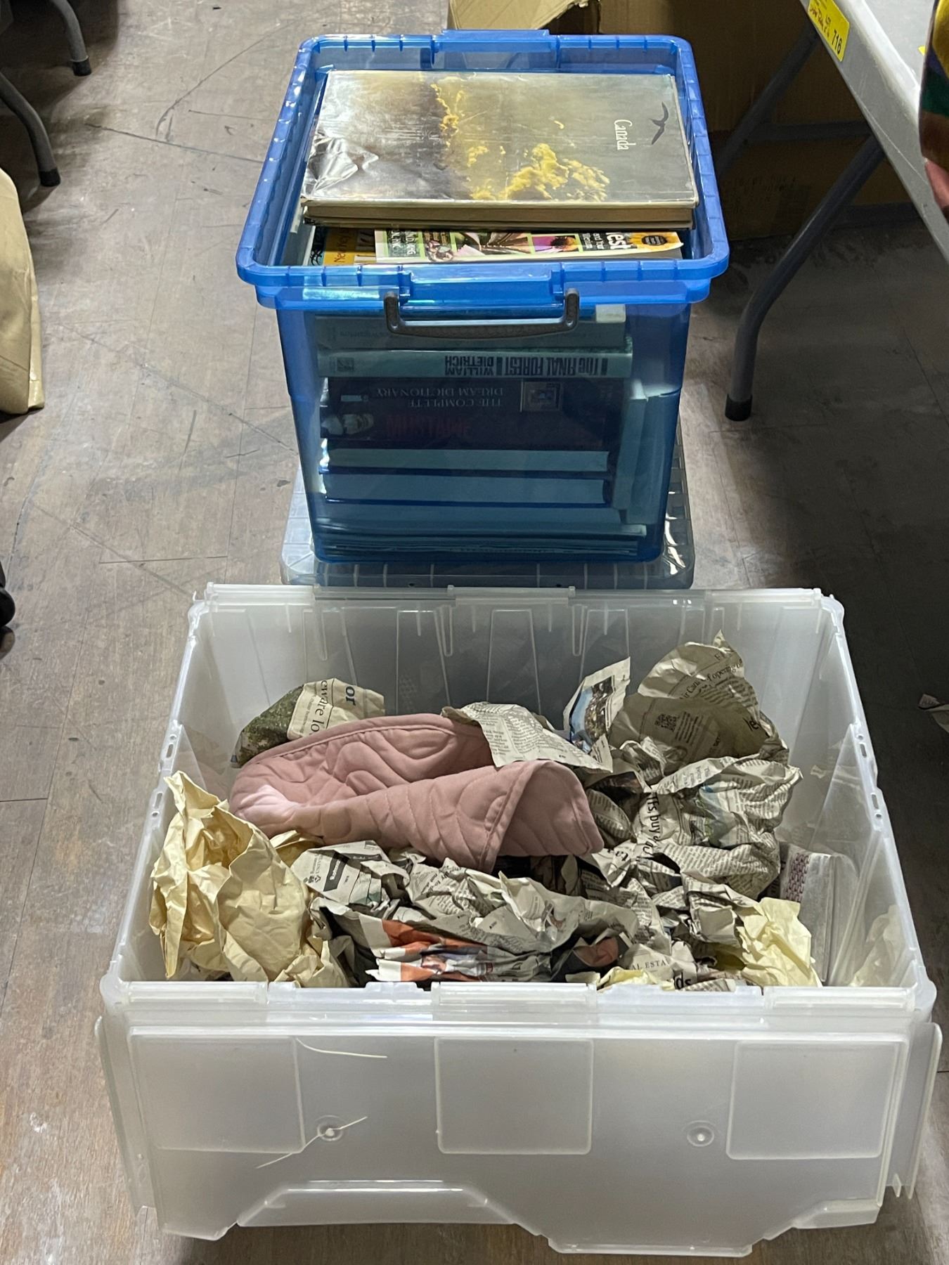 Under table lot - 4 bins/boxes + wicker baskets - Books / kitchen wares / microwave