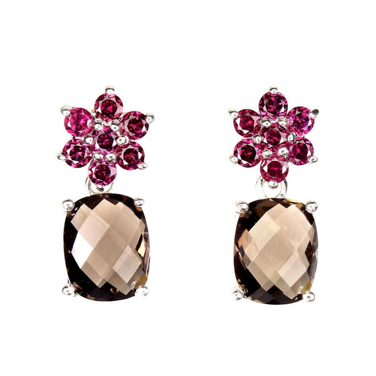 925 STERLING SILVER;PLATE...14K WHITE GOLD;MAIN STONE...SMOKY QUARTZ;OTHER GEMS...RHODOLITE GARNET;TOTAL WEIGHT...24.50 CT (TOTAL WEIGHT OF SILVER + STONE)DIMENSION* STONE 2.5 TO 10.0 X 8.0 MM. * FACE EARRINGS 21.0 X 8.0 MM.;MAIN STONE SHAPE....ANTIQUE CUT WITH CHECKER BOARD TABLE;MAIN STONE COLOR...TOP SMOKY;CLARITY/GRADE...IF TO VVS;LUSTER...ELEGANT;TREATMENT....UNHEATED;ORIGIN...BRAZIL;HARDNESS....7.0 - 7.5;