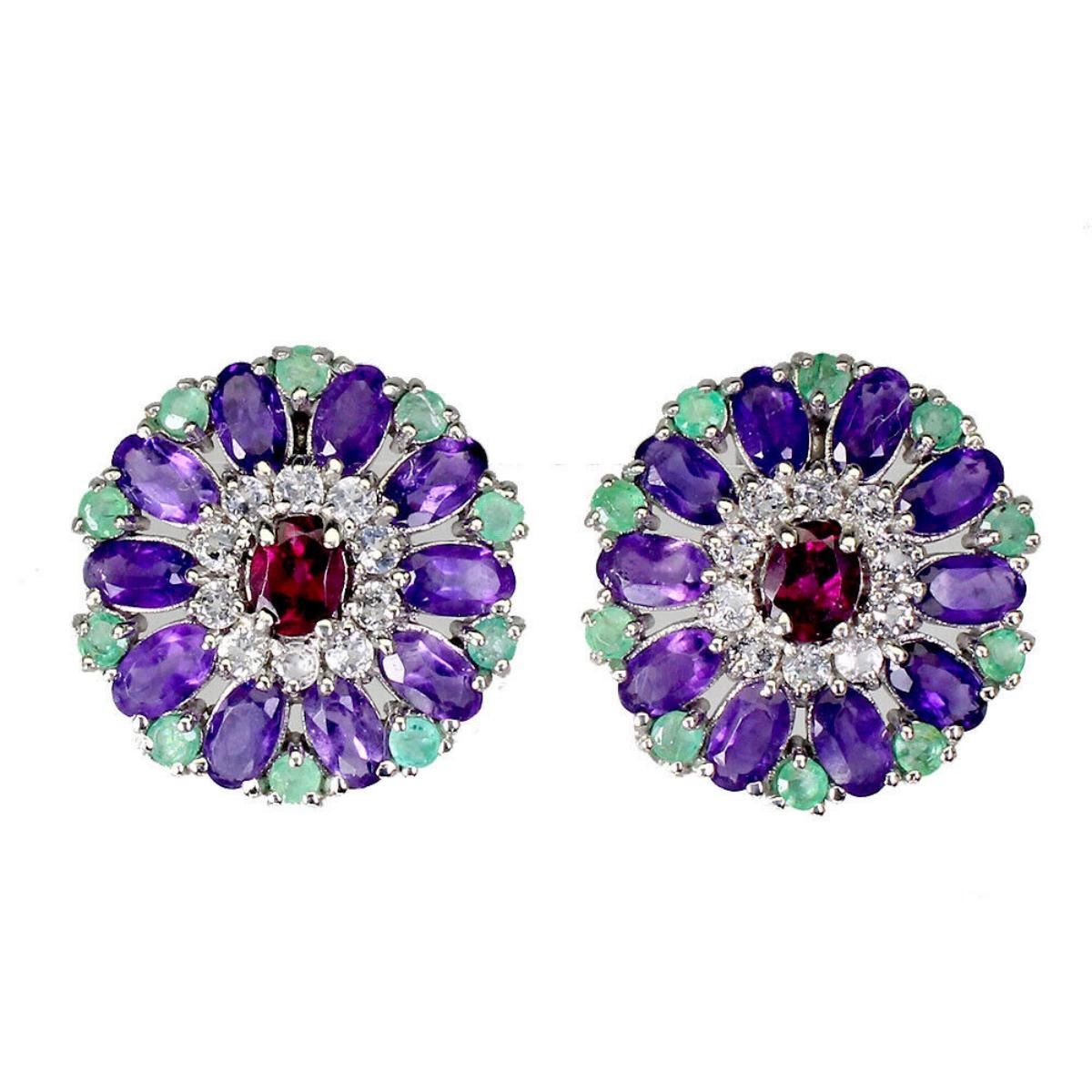 925 STERLING SILVER;PLATE-14K WHITE GOLD;MAIN STONE-RHODOLITE GARNET;OTHER GEMS-COLUMBIAN EMERALD, WHITE TOPAZ;TOTAL WEIGHT-5.89 GRAM (TOTAL WEIGHT OF SILVER + STONE);DIMENSION- * STONE 2.0 TO 4.0 X 3.0 MM.* FACE EARRINGS 19.0 X 19.0 MM.;MAIN STONE SHAPE-OVAL CUT;MAIN STONE COLOR- PINK RASPBERRY;CLARITY/GRADE-IF;TREATMENT-UNHEATED;ORIGIN-AFRICA/COLUMBIA;HARDNESS- 7.0 - 7.5;