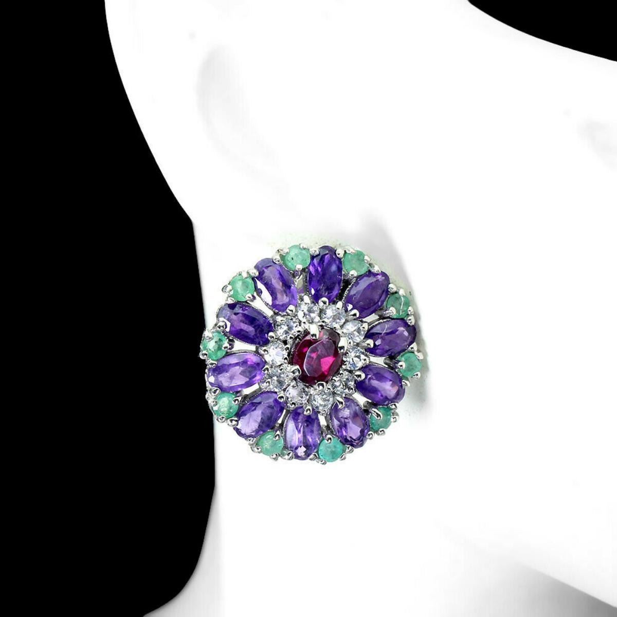 925 STERLING SILVER;PLATE-14K WHITE GOLD;MAIN STONE-RHODOLITE GARNET;OTHER GEMS-COLUMBIAN EMERALD, WHITE TOPAZ;TOTAL WEIGHT-5.89 GRAM (TOTAL WEIGHT OF SILVER + STONE);DIMENSION- * STONE 2.0 TO 4.0 X 3.0 MM.* FACE EARRINGS 19.0 X 19.0 MM.;MAIN STONE SHAPE-OVAL CUT;MAIN STONE COLOR- PINK RASPBERRY;CLARITY/GRADE-IF;TREATMENT-UNHEATED;ORIGIN-AFRICA/COLUMBIA;HARDNESS- 7.0 - 7.5;