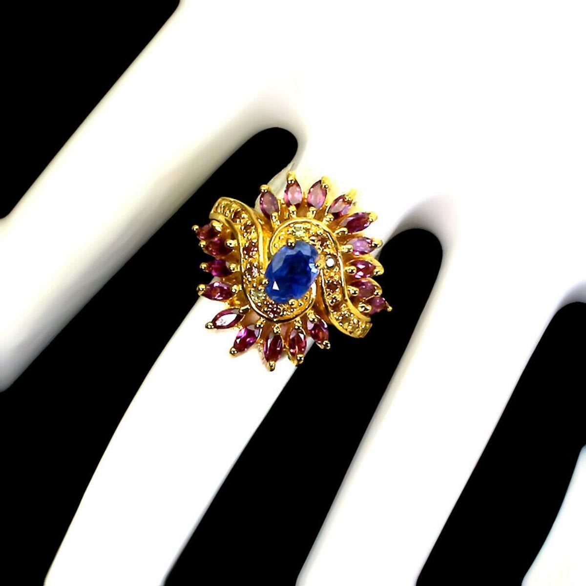 925 STERLING SILVER;PLATE-14K YELLOW GOLD;RING SIZE-8(RESIZABLE);MAIN STONE-KYANITE;OTHER GEMS-RHODOLITE GARNET, SAPPHIRE;TOTAL WEIGHT-5.91 GRAM (TOTAL WEIGHT OF SILVER + STONE);DIMENSION-* STONE 1.5 TO 7.0 X 5.0 MM. * RING SIZE 8.0 * FACE RING 23.0 X 22.0 MM.;MAIN STONE SHAPE-OVAL; MAIN STONE COLOR-CORNFLOWER BLUE;CLARITY/GRADE-IF TO VVS;TREATMENT-UNHEATED;ORIGIN-NEPAL;HARDNESS-5.0 - 7.0;