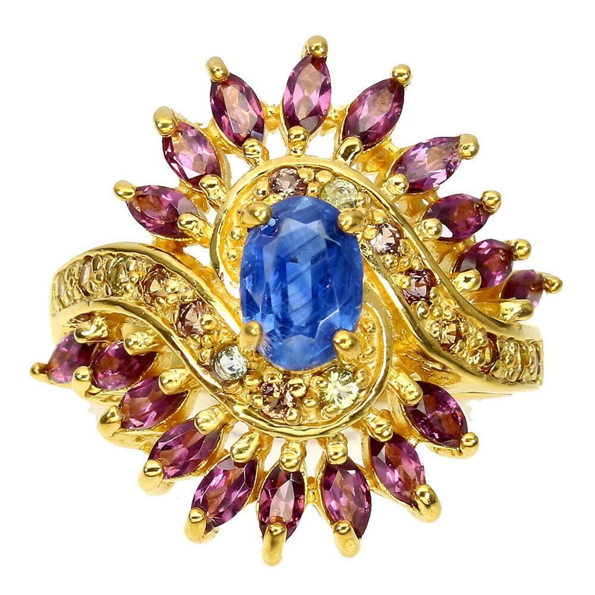 925 STERLING SILVER;PLATE-14K YELLOW GOLD;RING SIZE-8(RESIZABLE);MAIN STONE-KYANITE;OTHER GEMS-RHODOLITE GARNET, SAPPHIRE;TOTAL WEIGHT-5.91 GRAM (TOTAL WEIGHT OF SILVER + STONE);DIMENSION-* STONE 1.5 TO 7.0 X 5.0 MM. * RING SIZE 8.0 * FACE RING 23.0 X 22.0 MM.;MAIN STONE SHAPE-OVAL; MAIN STONE COLOR-CORNFLOWER BLUE;CLARITY/GRADE-IF TO VVS;TREATMENT-UNHEATED;ORIGIN-NEPAL;HARDNESS-5.0 - 7.0;