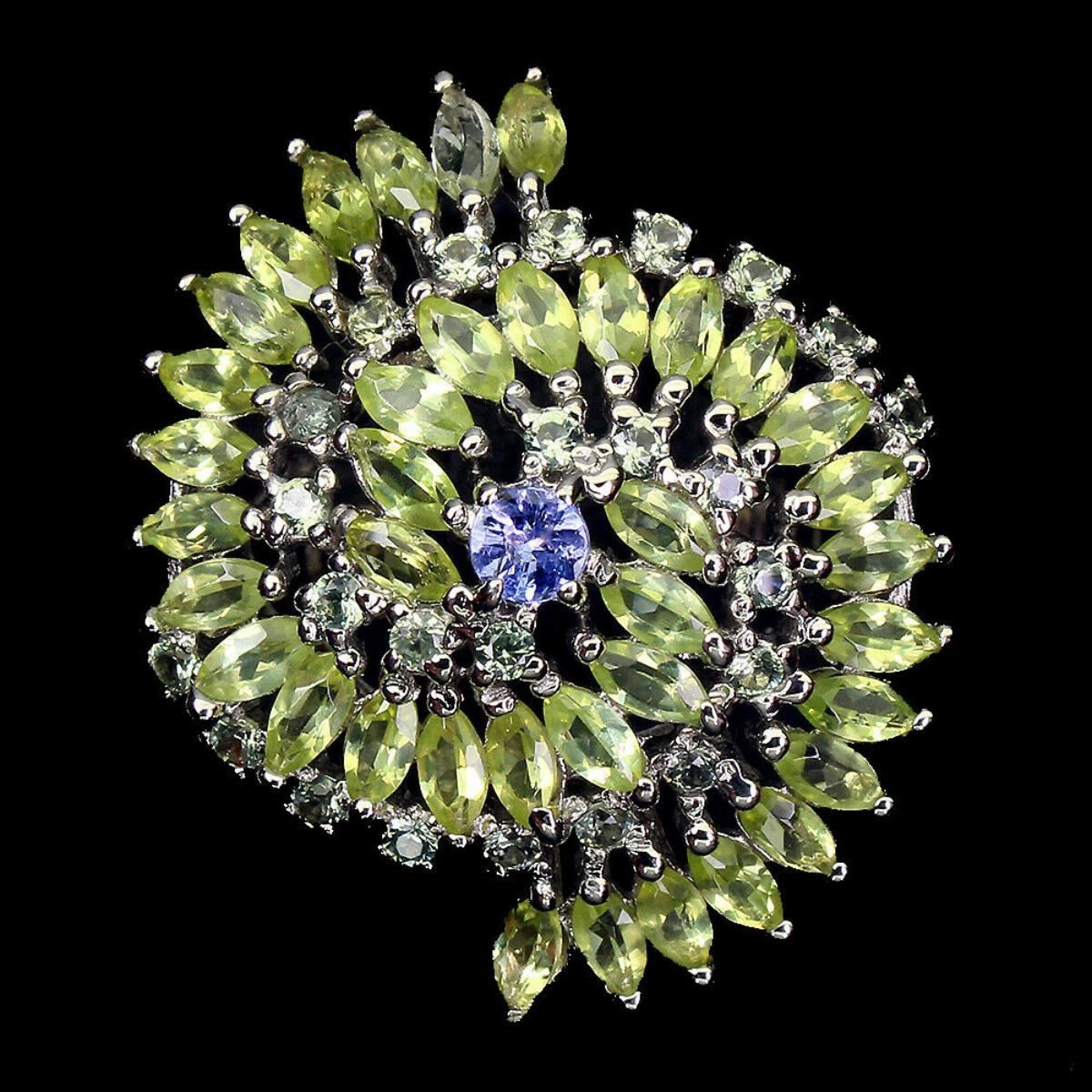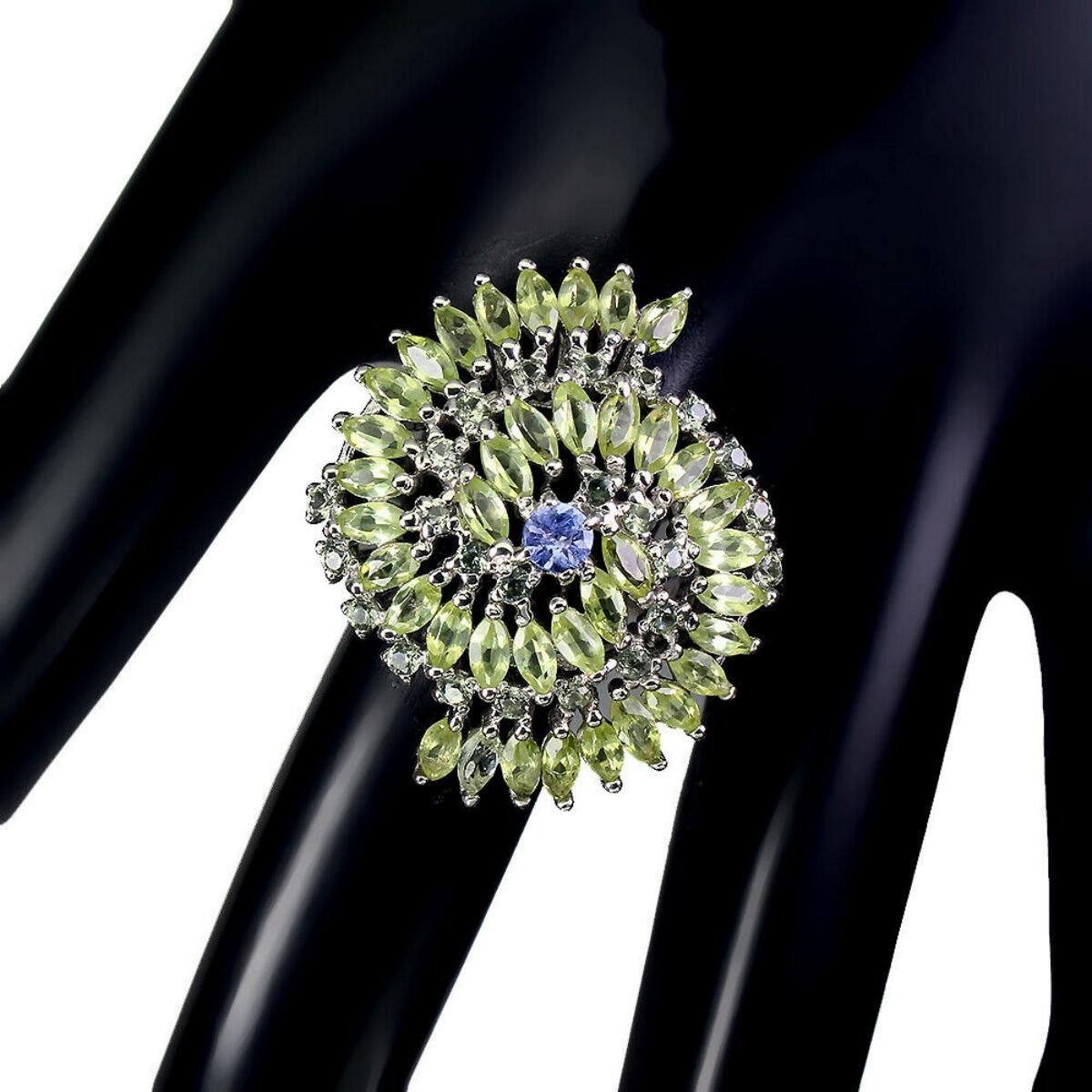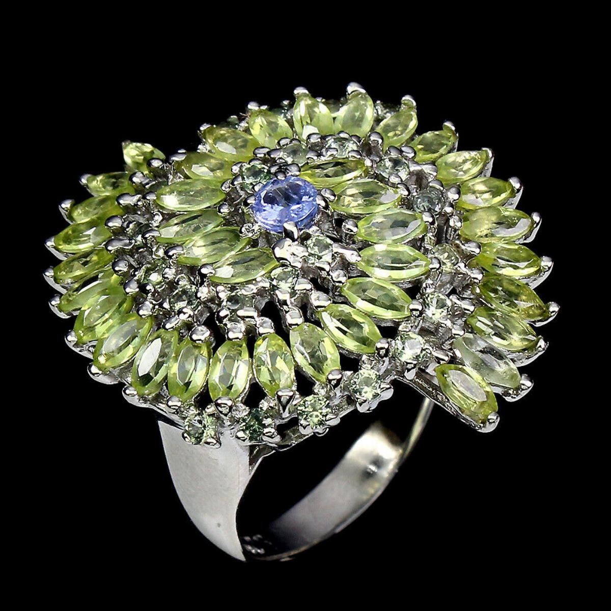 925 STERLING SILVER;PLATE-14K WHITE GOLD;RING SIZE-8(RESIZABLE);MAIN STONE-PERIDOT;OTHER GEMS-TANZANITE;TOTAL WEIGHT-7.24 GRAM (TOTAL WEIGHT OF SILVER + STONE);DIMENSION-* STONE 2.0 TO 4.0 X 2.0 MM. * RING SIZE 8.0 * FACE RING 30.0 X 25.0 MM.;MAIN STONE SHAPE-MARQUISE CUT;MAIN STONE COLOR- GREEN;CLARITY/GRADE-IF TO VVS;TREATMENT-UNHEATED;ORIGIN-PAKISTAN;HARDNESS-6;