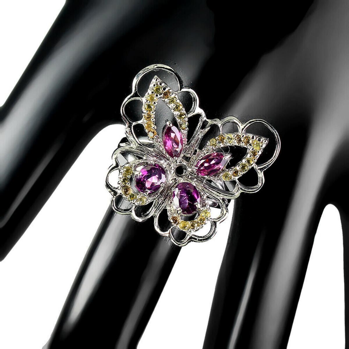 925 STERLING SILVER;PLATE-14K WHITE GOLD;RING SIZE-9(RESIZABLE)MAIN STONE-RHODOLITE GARNET;OTHER GEMS-SAPPHIRE;TOTAL WEIGHT-5.13 GRAM (TOTAL WEIGHT OF SILVER + STONE);DIMENSION-* STONE 1.5 TO 6.0 X 3.0 MM. * RING SIZE 9.0 * FACE RING 25.0 X 22.0 MM.;MAIN STONE SHAPE-OVAL CUT;MAIN STONE COLORPINK RASPBERRY;CLARITY/GRADE-IF TO VVS;TREATMENT-UNHEATED;ORIGIN-AFRICA;HARDNESS-7;