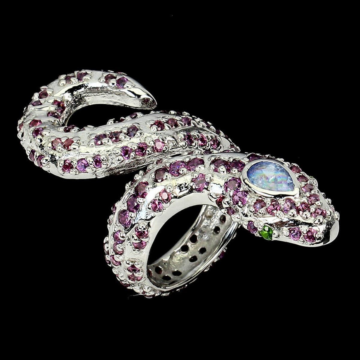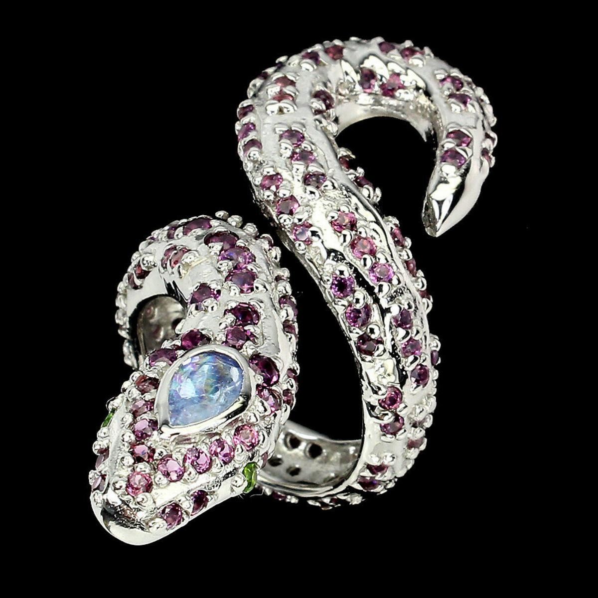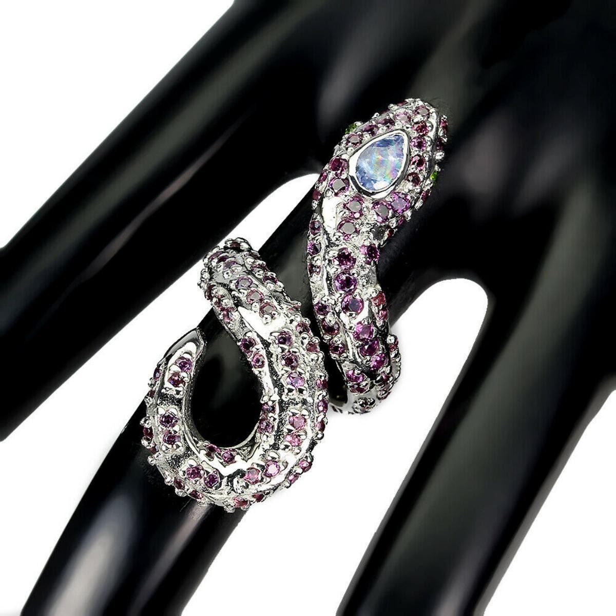 925 STERLING SILVER;PLATE-14K WHITE GOLD;RING SIZE-5.5;MAIN STONE-TANZANITE;OTHER GEMS-CHROME DIOPSIDE, RHODOLITE GARNET;TOTAL WEIGHT-10.4 GRAM (TOTAL WEIGHT OF SILVER + STONE);DIMENSION-* STONE 1.5 TO 6.0 X 4.0 MM.* RING SIZE 5.5* FACE RING 42.0 X 21.0 MM.;MAIN STONE SHAPE-PEAR CUT;MAIN STONE COLOR- BLUE VIOLET;CLARITY/GRADE-IF TO VVS;TREATMENT-UNHEATED;ORIGIN-TANZANIA - AFRICA;HARDNESS-7.0 - 7.5;
