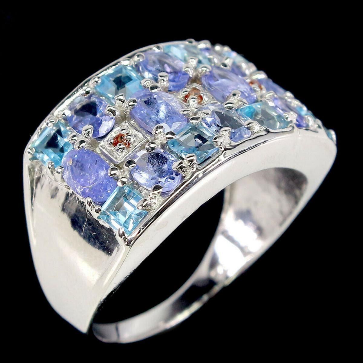 925 STERLING SILVER;PLATE-14K WHITE GOLD;RING SIZE-8(RESIZABLE);MAIN STONE-TANZANITE;OTHER GEMS-SWISS BLUE TOPAZ, SAPPHIRE DIAMOND CUT;TOTAL WEIGHT-5.4 GRAM (TOTAL WEIGHT OF SILVER + STONE);DIMENSION-* STONE 1.5 TO 5.0 X 3.0 MM. * RING SIZE 8.0 * FACE RING 21.0 X 13.0 MM.;MAIN STONE SHAPE-OVAL CUT;MAIN STONE COLOR- BLUE VIOLET;TREATMENT-UNHEATED;ORIGIN-TANZANIA - AFRICA;HARDNESS-7;
