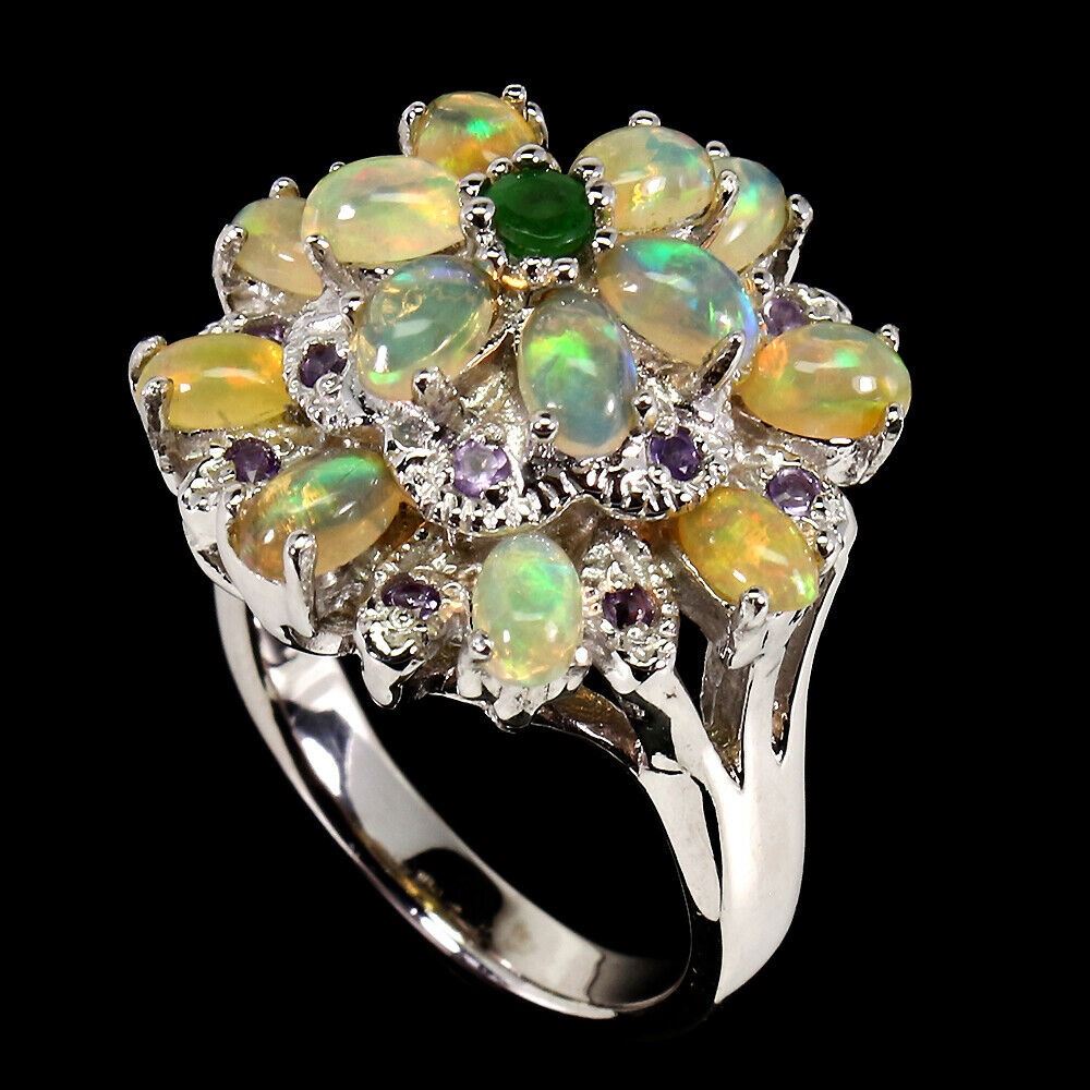 925 STERLING SILVER;PLATE-14K WHITE GOLD;RING SIZE-7(resizeable);MAIN STONE- OPAL;OTHER GEMS-AMETHYST, EMERALD;TOTAL WEIGHT-10.89 GRAM (TOTAL WEIGHT OF SILVER + STONE)DIMENSION* STONE 1.5 TO 5.0 X 3.0 MM. * RING SIZE 7.0 * FACE RING 22.0 X 21.0 MM.;MAIN STONE SHAPE-OVAL CABOCHON;MAIN STONE COLOR-MULTI-COLOR;CLARITY/GRADE-TRANSPARENT;LUSTER-GORGEOUS;TREATMENT-UNHEATEDORIGIN-ETHIOPIA;HARDNESS5.5 - 8.0;