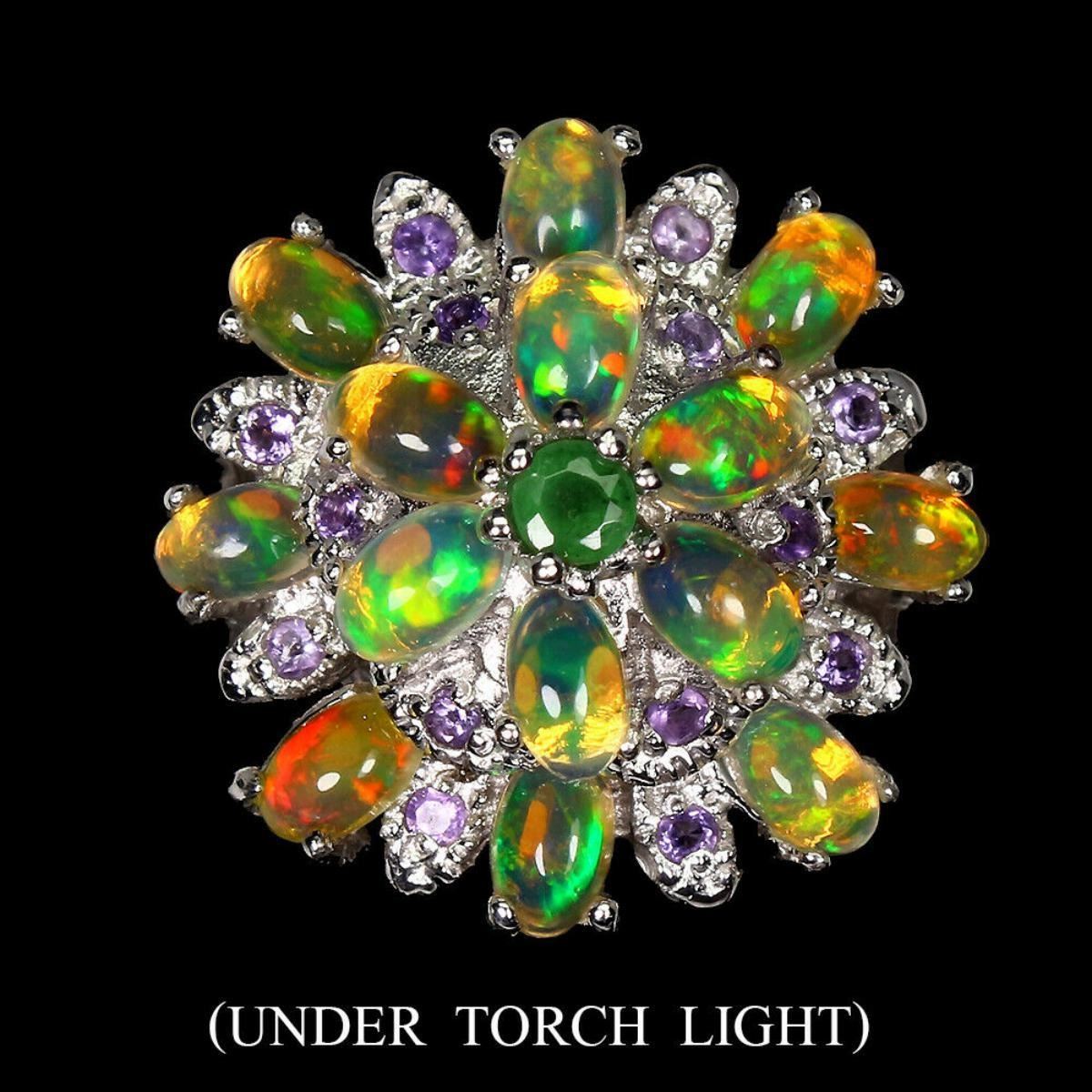 925 STERLING SILVER;PLATE-14K WHITE GOLD;RING SIZE-7(resizeable);MAIN STONE- OPAL;OTHER GEMS-AMETHYST, EMERALD;TOTAL WEIGHT-10.89 GRAM (TOTAL WEIGHT OF SILVER + STONE)DIMENSION* STONE 1.5 TO 5.0 X 3.0 MM. * RING SIZE 7.0 * FACE RING 22.0 X 21.0 MM.;MAIN STONE SHAPE-OVAL CABOCHON;MAIN STONE COLOR-MULTI-COLOR;CLARITY/GRADE-TRANSPARENT;LUSTER-GORGEOUS;TREATMENT-UNHEATEDORIGIN-ETHIOPIA;HARDNESS5.5 - 8.0;