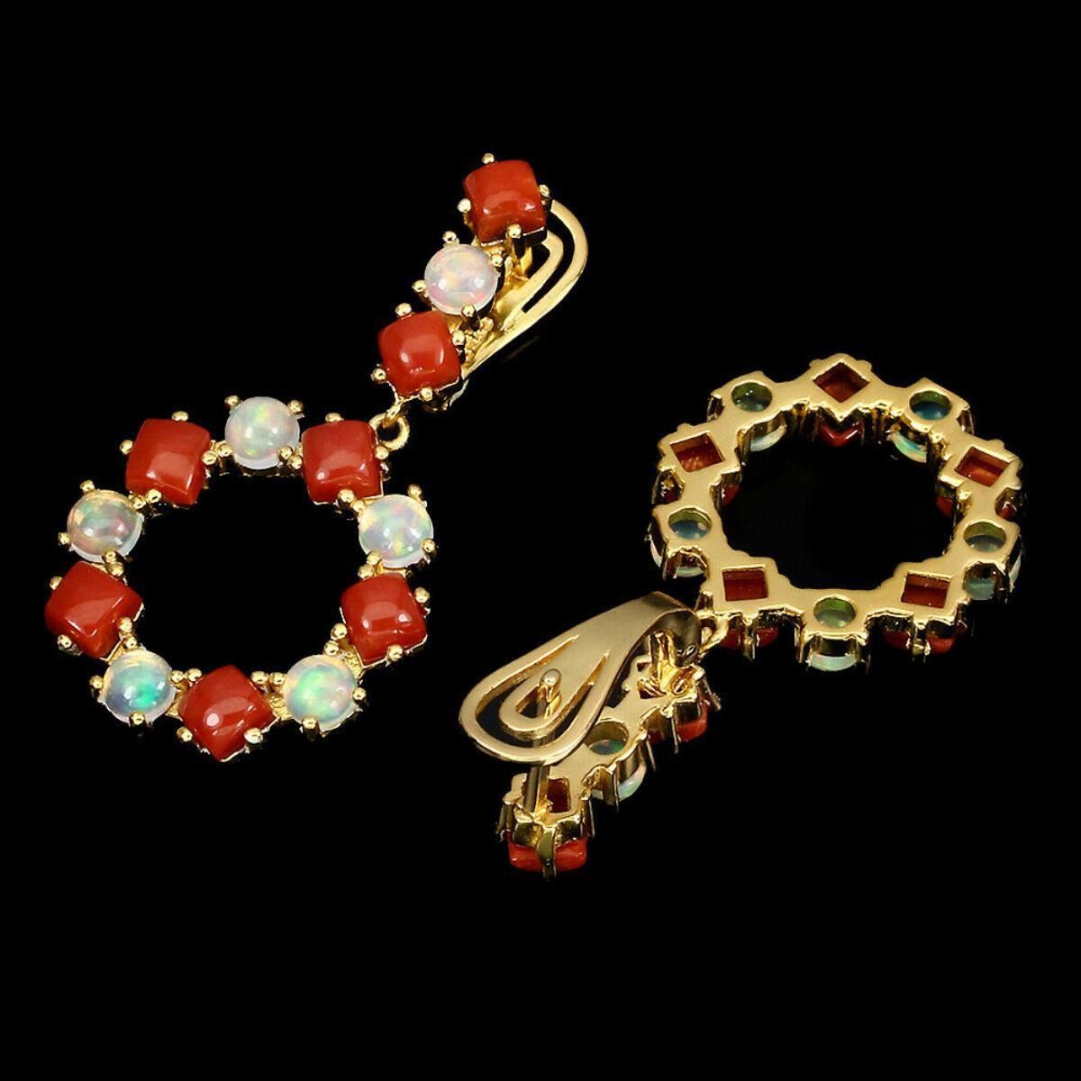 925 STERLING SILVER; PLATE -14K YELLOW GOLD; MAIN STONE -FIRE OPAL; OTHER GEMS -CORAL; TOTAL WEIGHT -8.54 GRAM (TOTAL WEIGHT OF SILVER + STONE) DIMENSION * STONE 4.0 MM. * FACE EARRINGS 39.0 X 21.0 MM.; MAIN STONE SHAPE -ROUND CABOCHON; MAIN STONE COLOR -RAINBOW FULL FLASH; CLARITY/GRADE -TRANSPARENT; LUSTER -GORGEOUS; TREATMENT -UNHEATED; ORIGIN -ETHIOPIA; HARDNESS -5.5 - 6.5