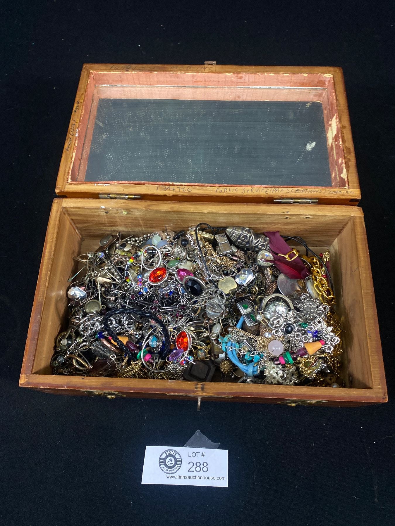 Unique Vintage Wood Box w/Lot Of Misc. Jewelry,Lot Of Earrings