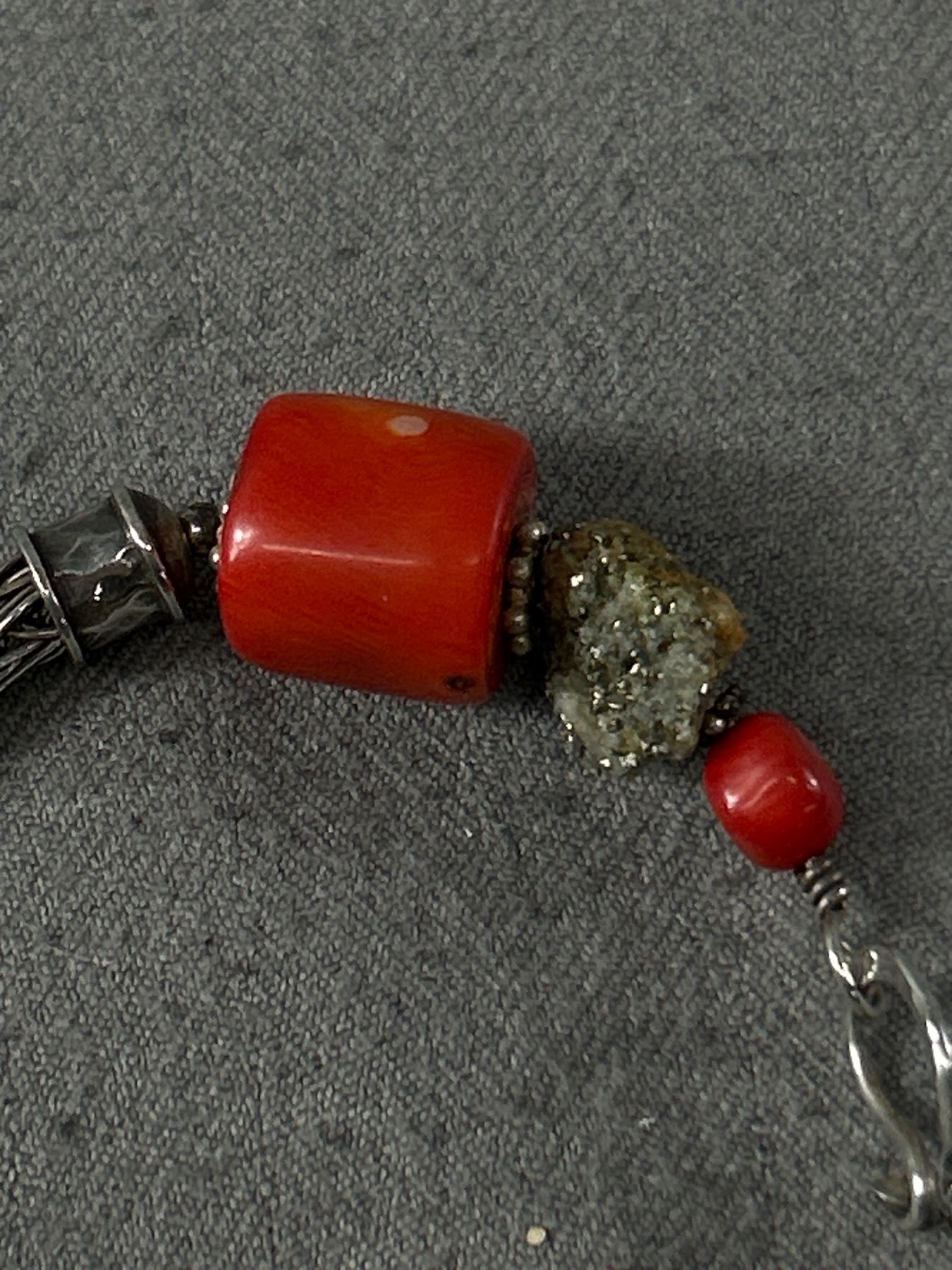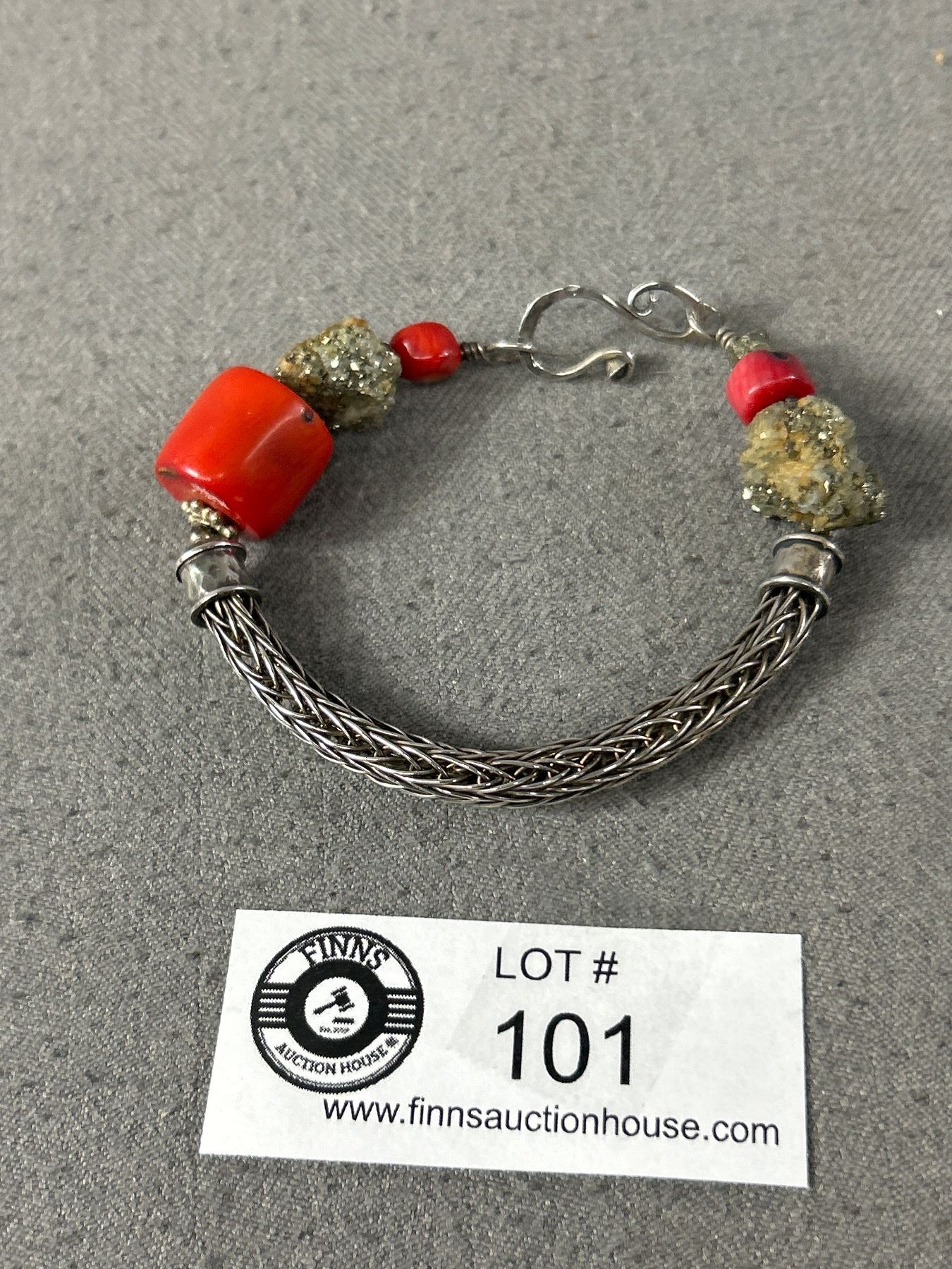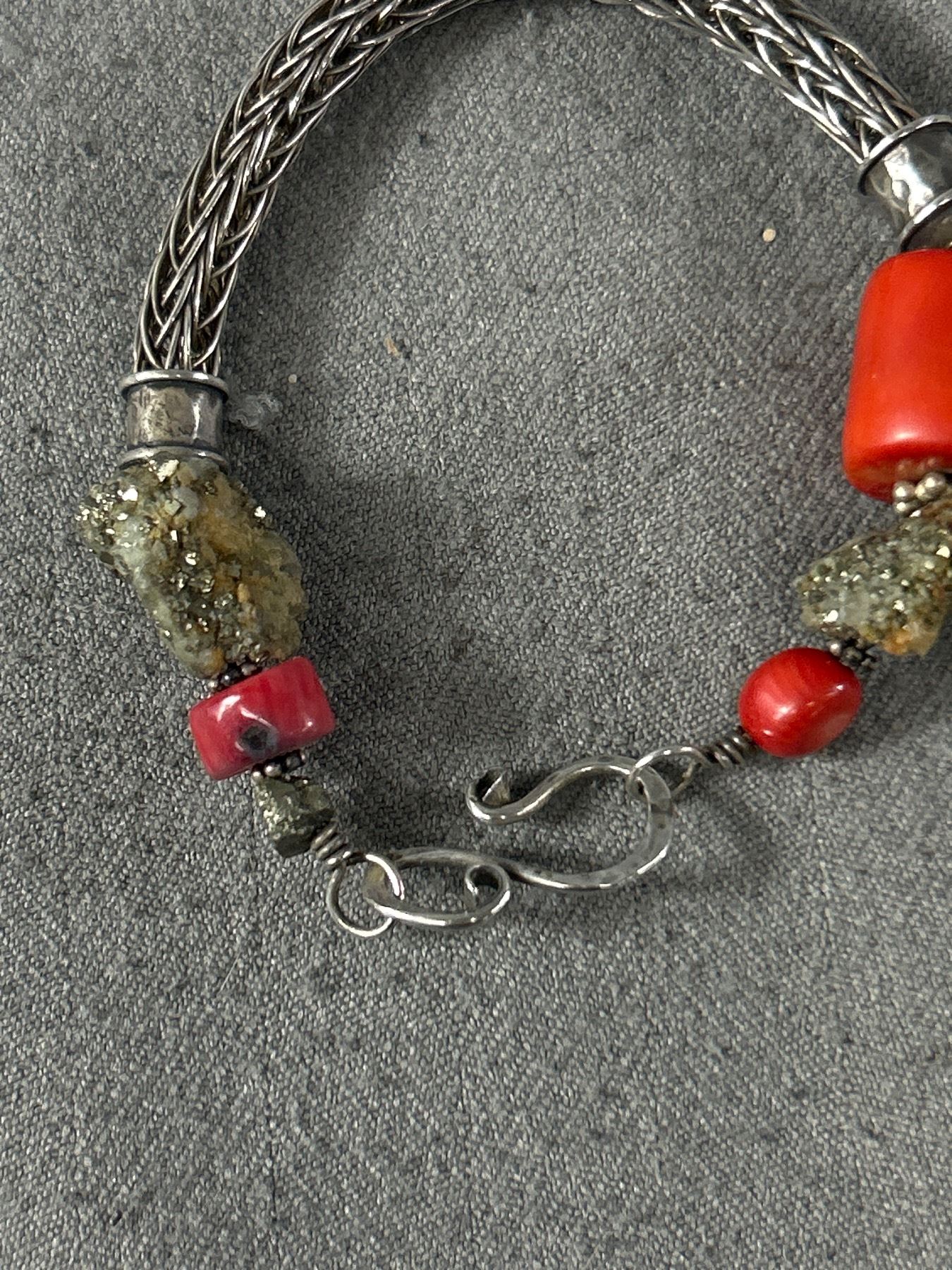 Unusual Sterling Silver 925 Coral & Pyrite Woven Bracelet 7.5" - Good Flexability - Tested