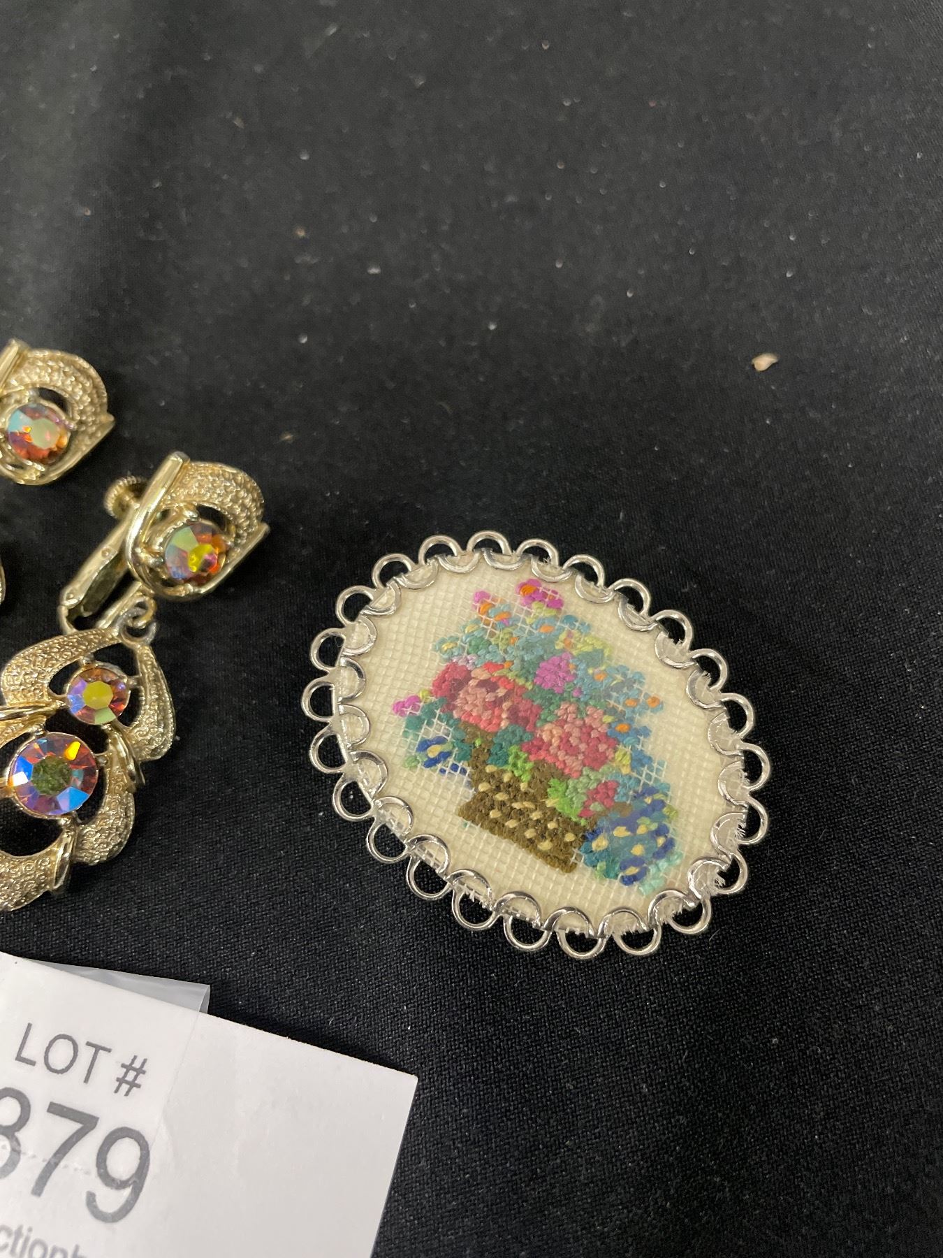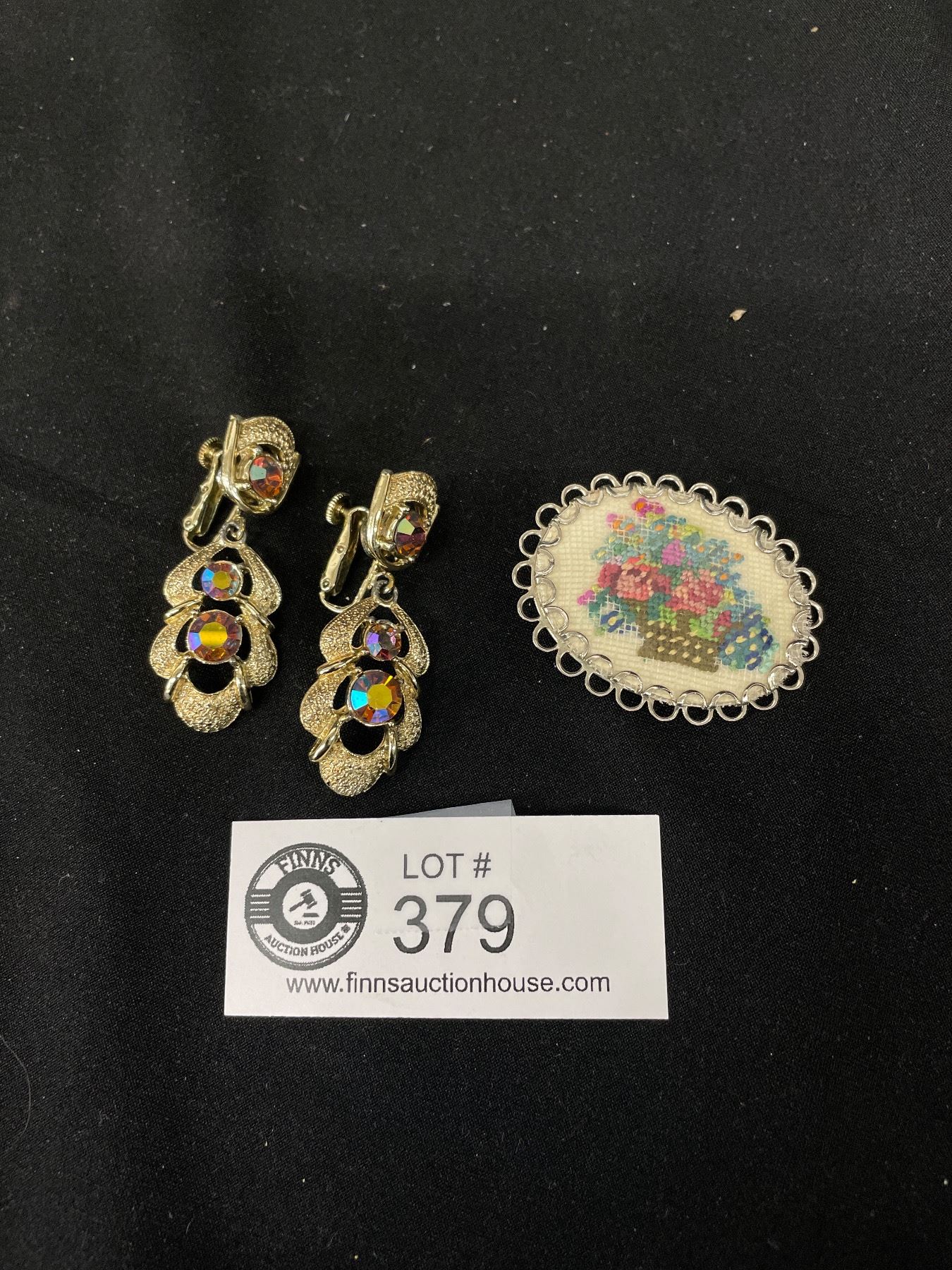 Unusual Vintage Petit Point Brooch and 50s Rhinestone Earrings