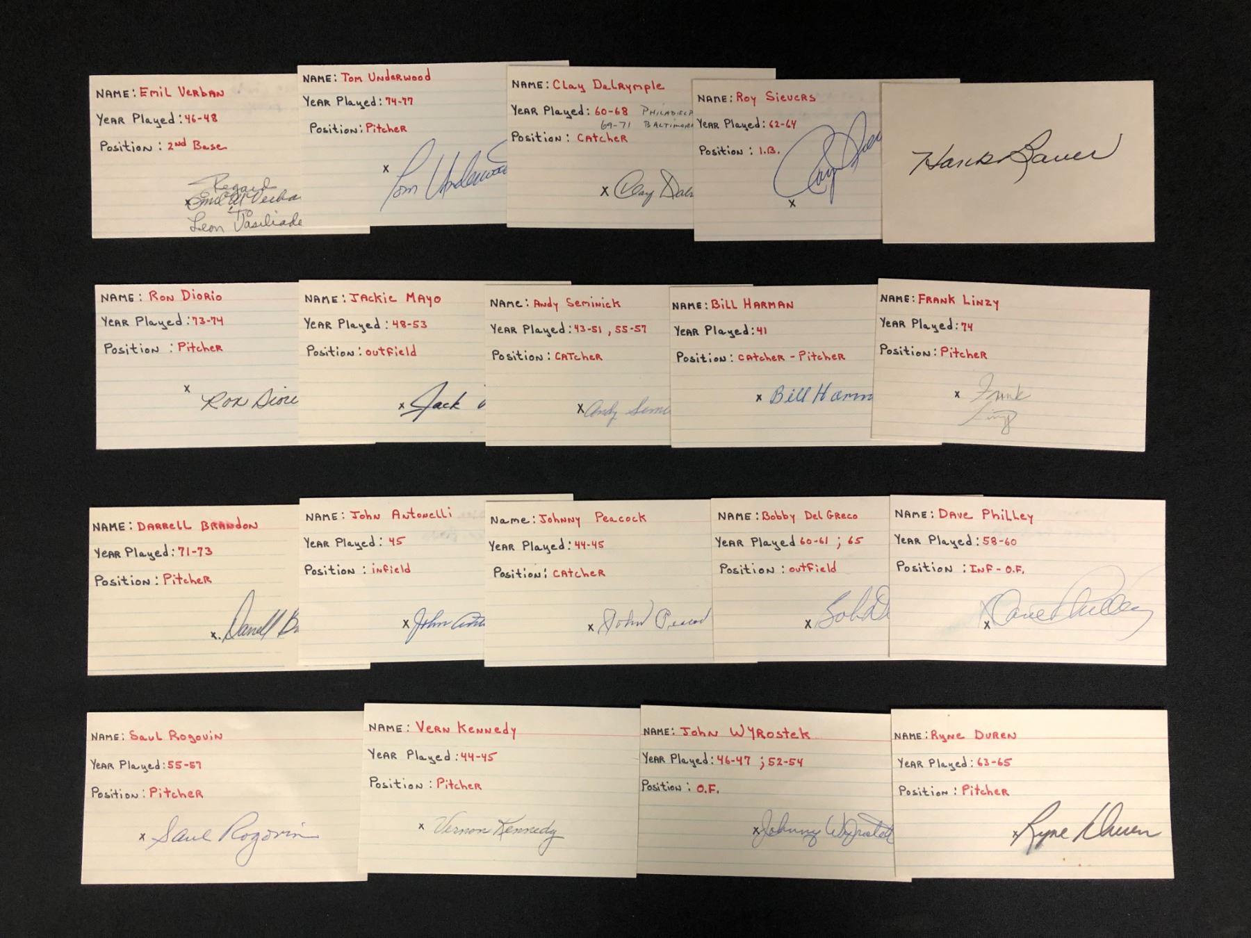 VARIOUS AUTOGRAPHED INDEX CARDS LOT