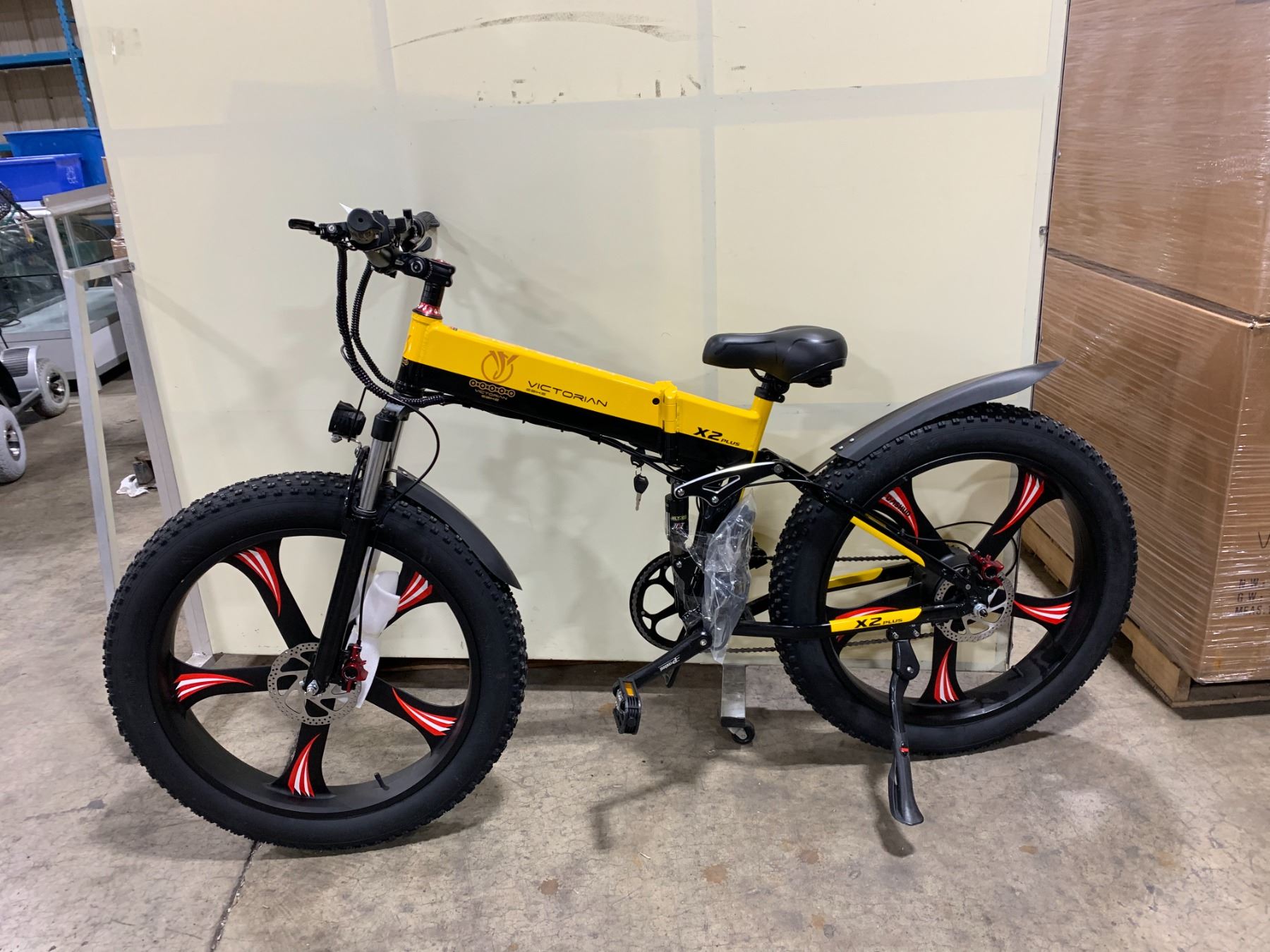 VICTORIAN EBIKE X2 PLUS YELLOW/BLACK FOLDING FULL SUSPENSION ELECTRIC BIKE WITH FULL DISC BRAKES, BATTERY-48V 13AMP, 1000 WATT MOTOR, MAX SPEED-32KM/H, TIRE: 26 X 4, RANGE: UP TO 55KM, LOADING CAPACITY: 340LBS