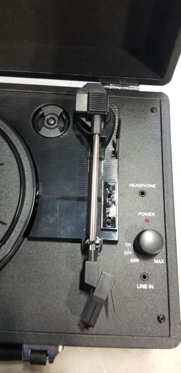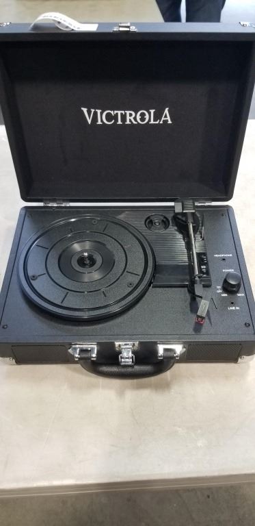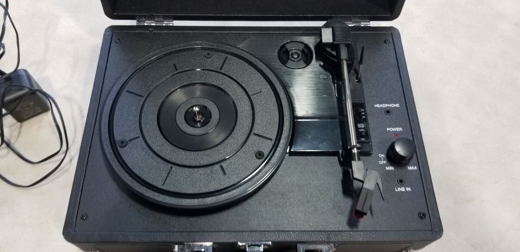 VICTROLA SUITCASE RECORD PLAYER, BLACK WITH POWER ADAPTOR, RETAIL $100