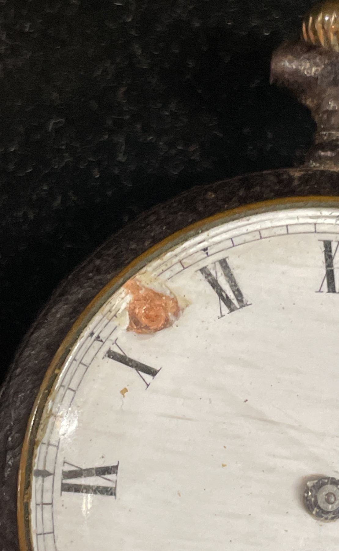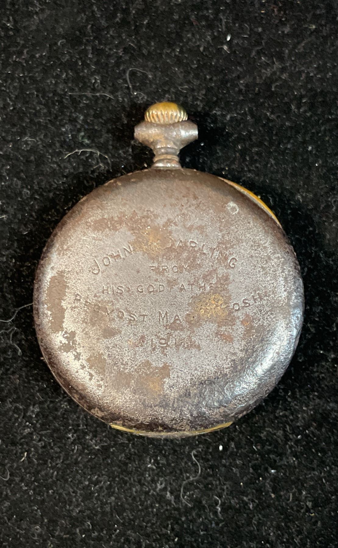 VINTAGE 1911 POCKET WATCH WITH REAR INSCRIPTION (DOES NOT TICK, TIMER WORKS, FACE DAMAGED)