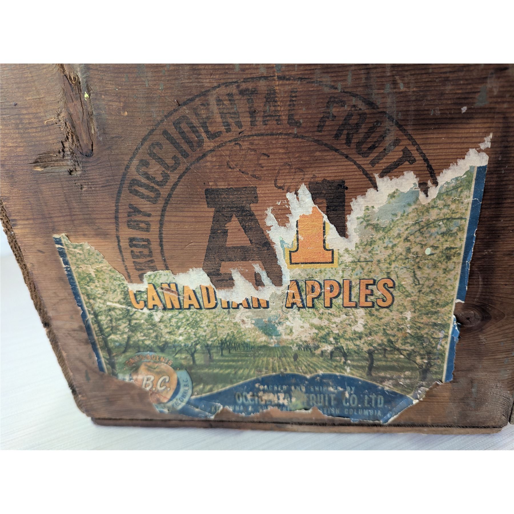 vintage wooden crate label for "Canadian Apples" from "Occidental Fruit Co. Ltd." located in "Kelowna & Summerland, British Columbia".