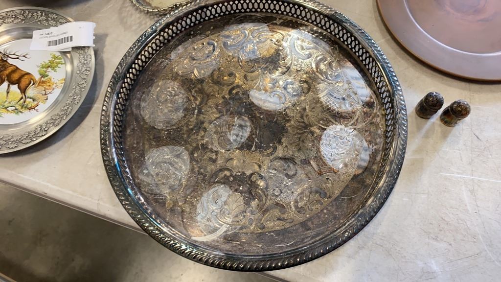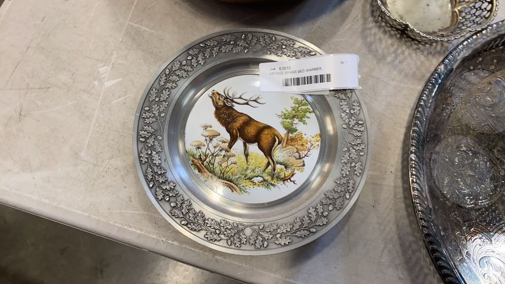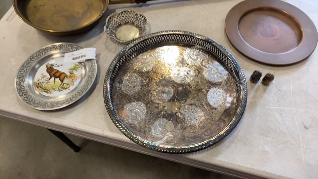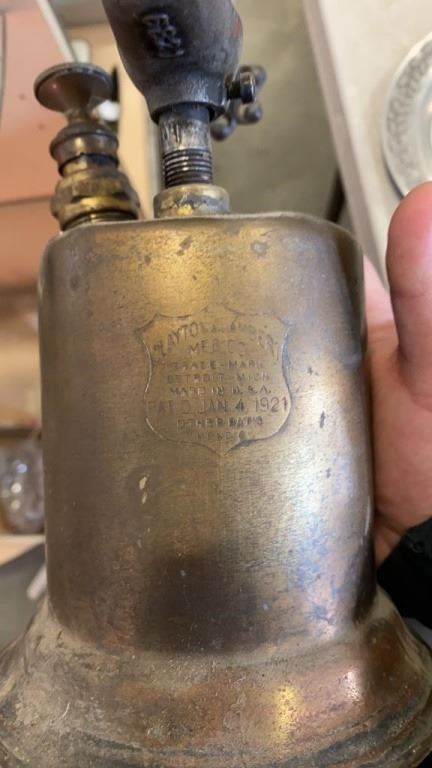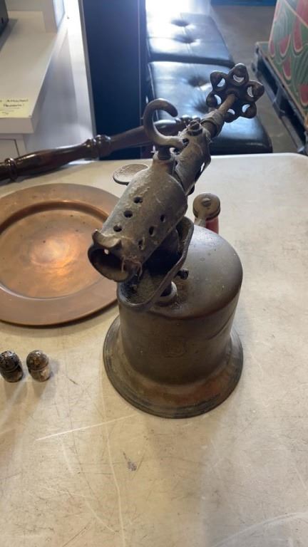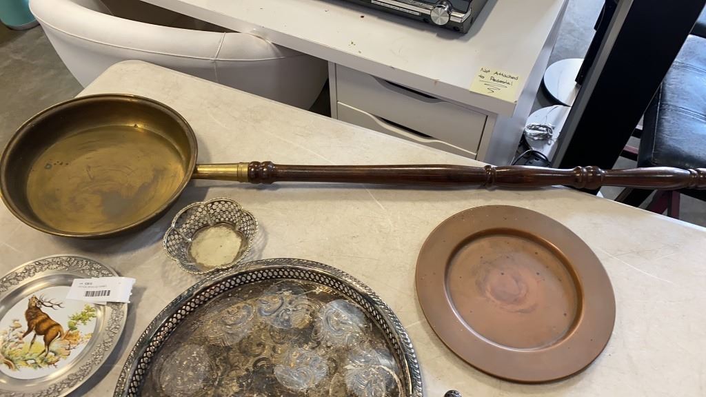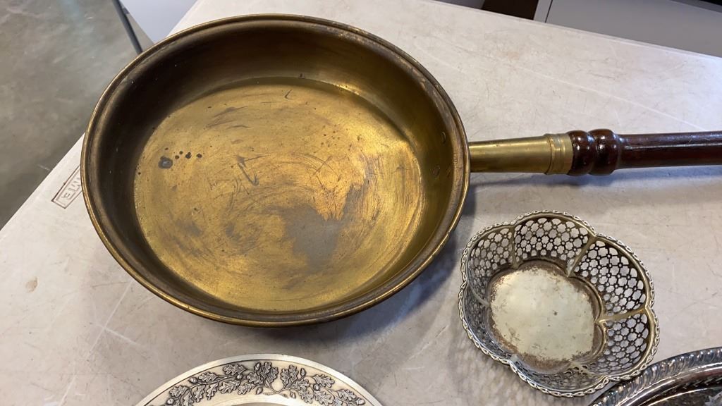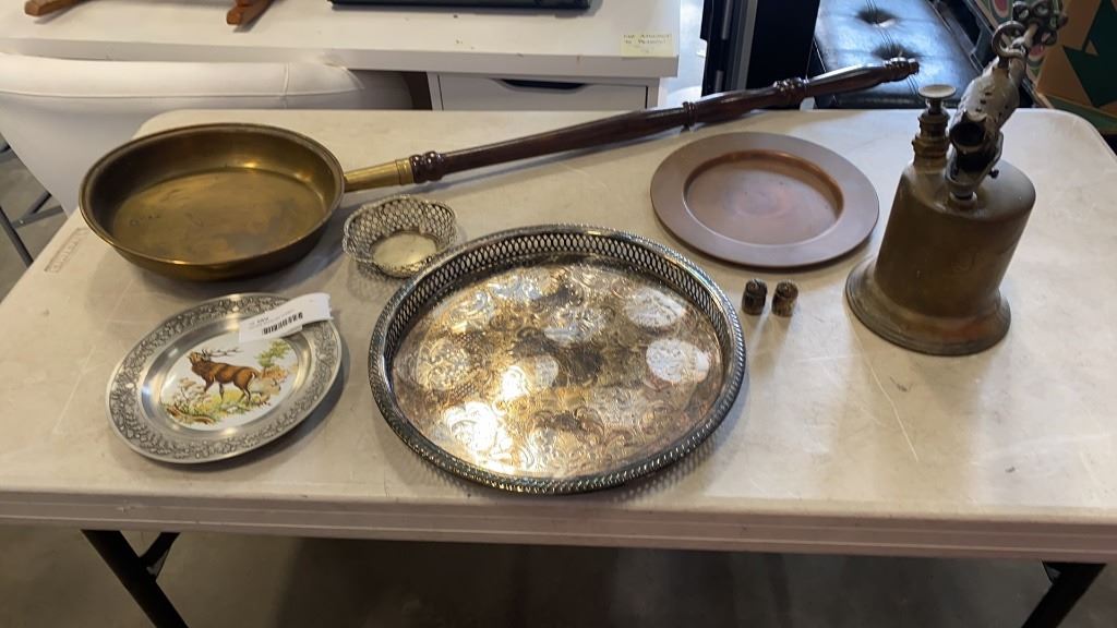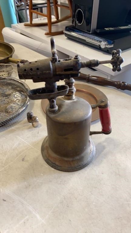 VINTAGE BRASS BED WARMER, BLOWTORCH, COPPER PLATE AND SILVER PLATE COLLECTIBLES