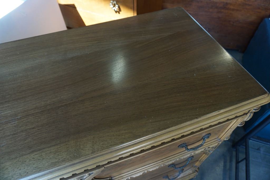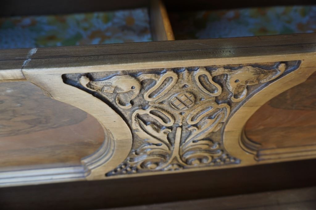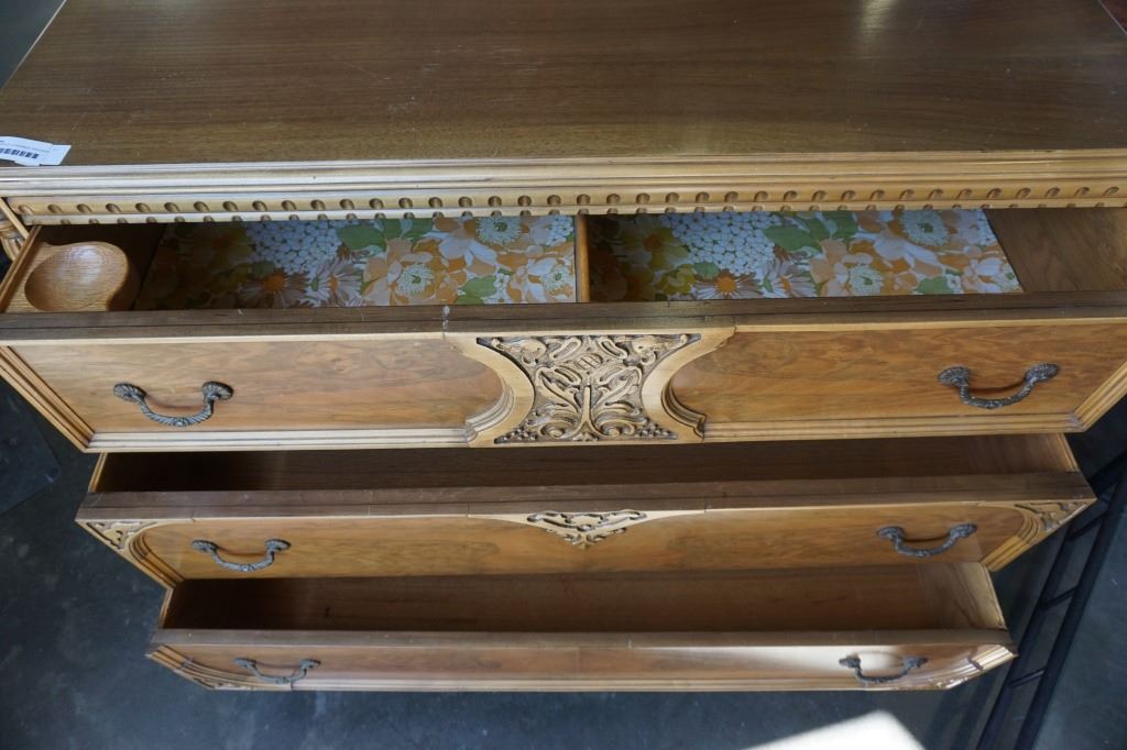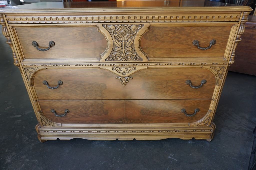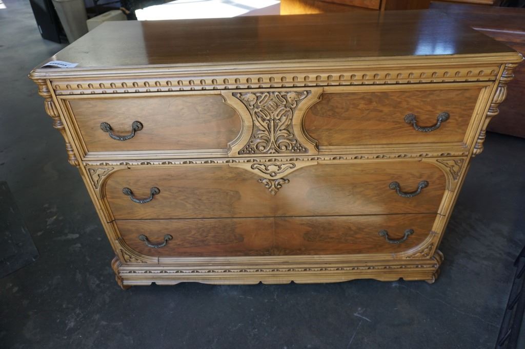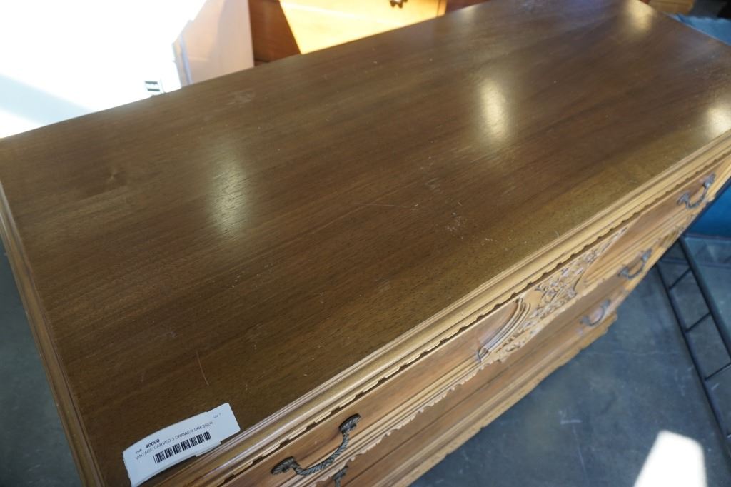 VINTAGE CARVED 3 DRAWER DRESSER - 4 FOOT WIDE X 20 INCHES DEEP X 34 TALL