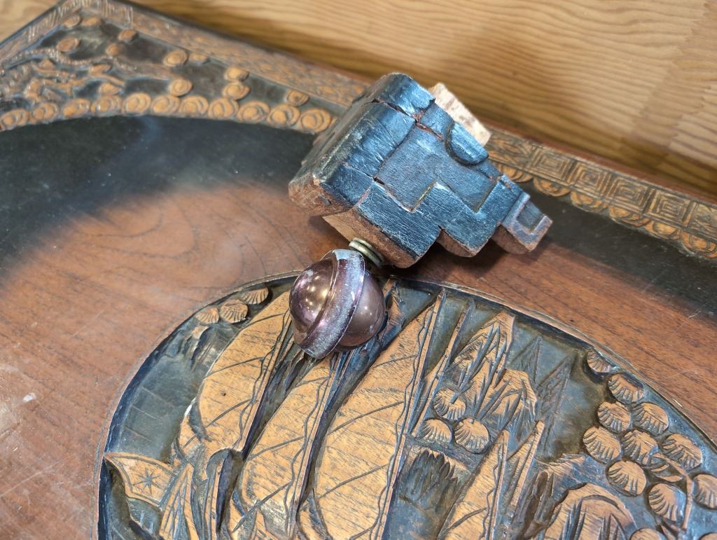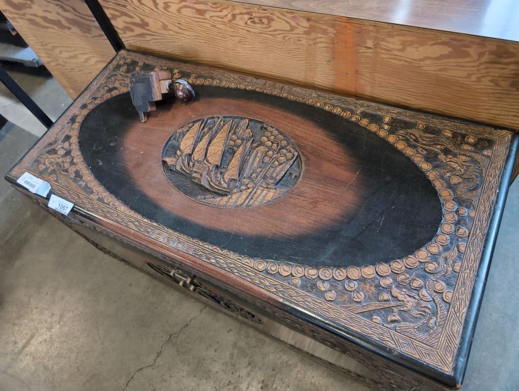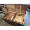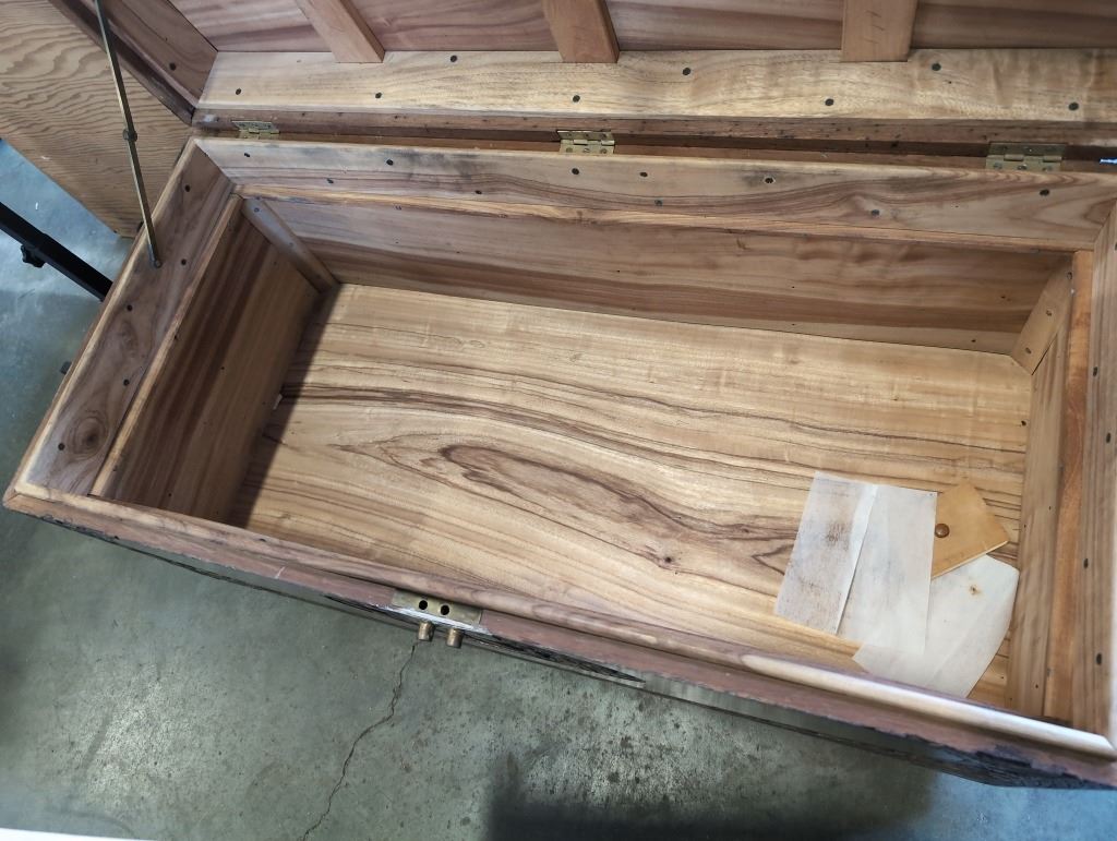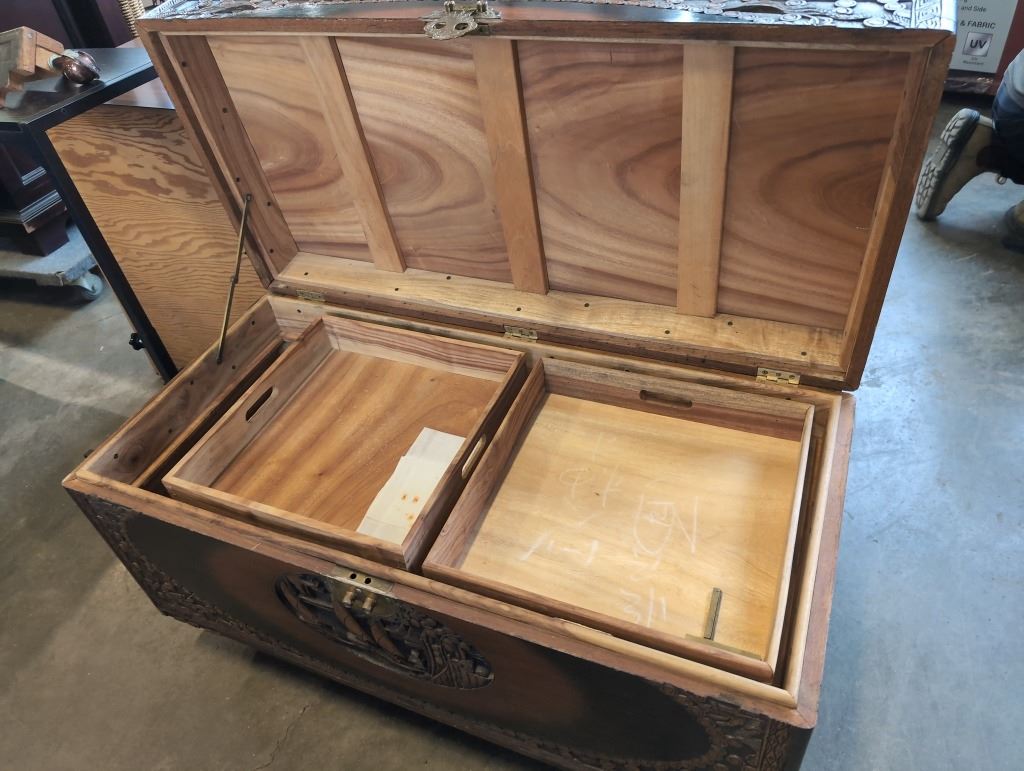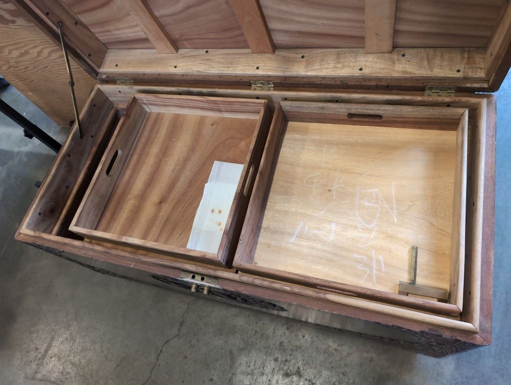 VINTAGE CARVED CEDAR LINED TRUNK - BROKEN LEG