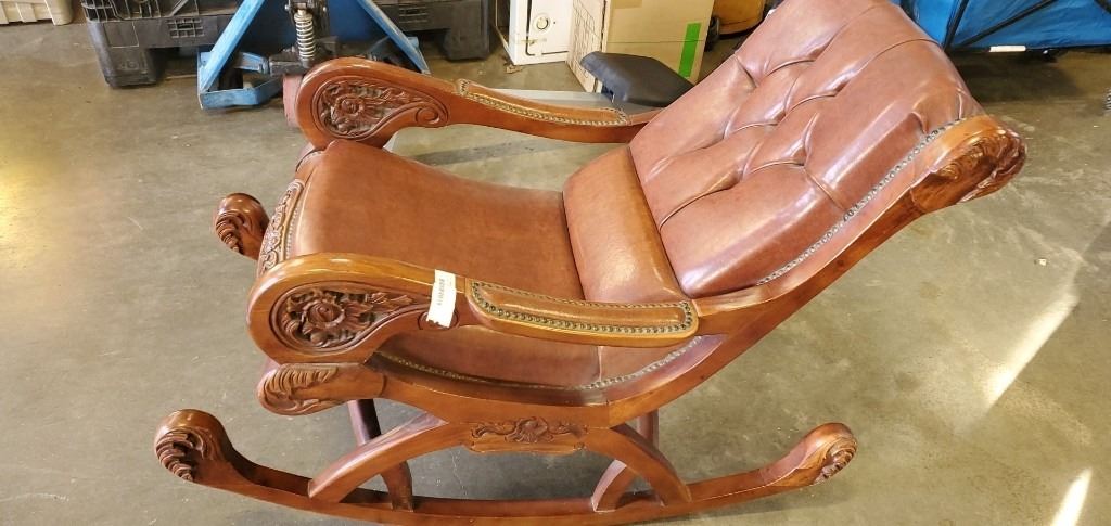 VINTAGE CARVED WOOD AND LEATHER ROCKING CHAIR