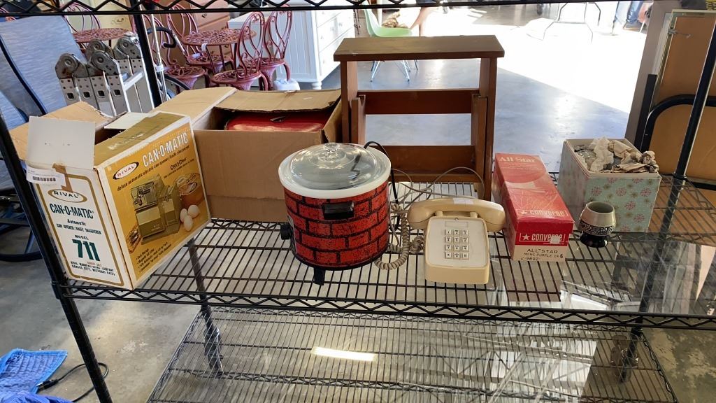 VINTAGE CERAMICS, ALBERTA JUG, CROCK POT, PICNIC BASKET, CAN O MATIC CAN OPENER KNIFE SHARPENER AND PHONE