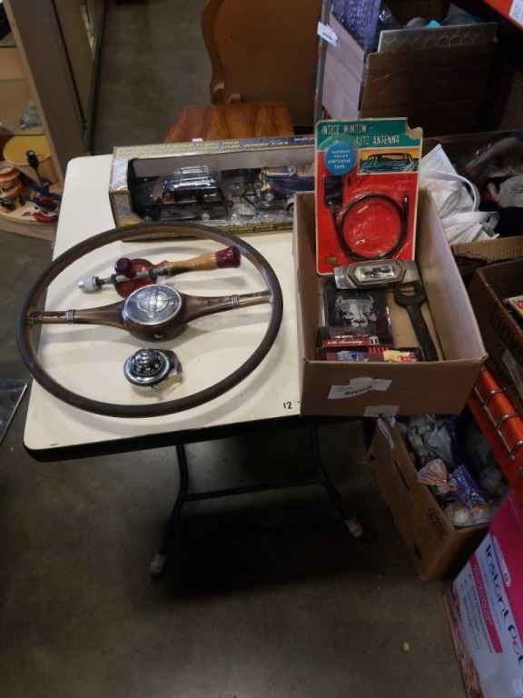 VINTAGE CHEVROLET STEERING WHEEL, DIE CAST METAL CAR SET AND TRAY OF CAR COLLECTIBLES, VEHICLE BADGE