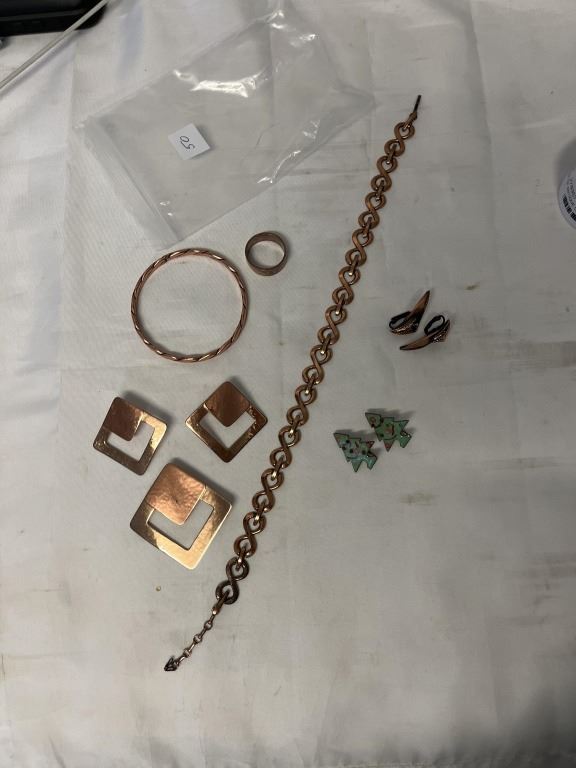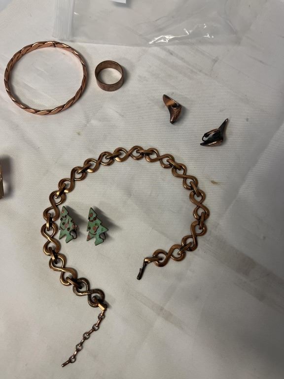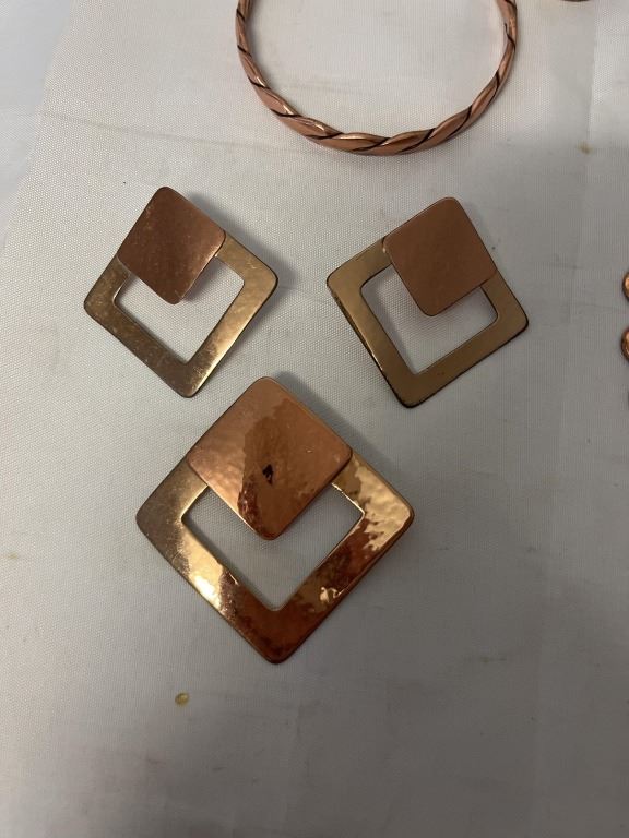 VINTAGE COPPER NECKLACE, BANGLE, RING BAND, 2 PAIRS OF CLIP ON EARRINGS, AND BROOCH W/ MATCHING EARR