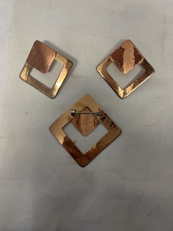 VINTAGE COPPER NECKLACE, BANGLE, RING BAND, 2 PAIRS OF CLIP ON EARRINGS, AND BROOCH W/ MATCHING EARRINGS SET
