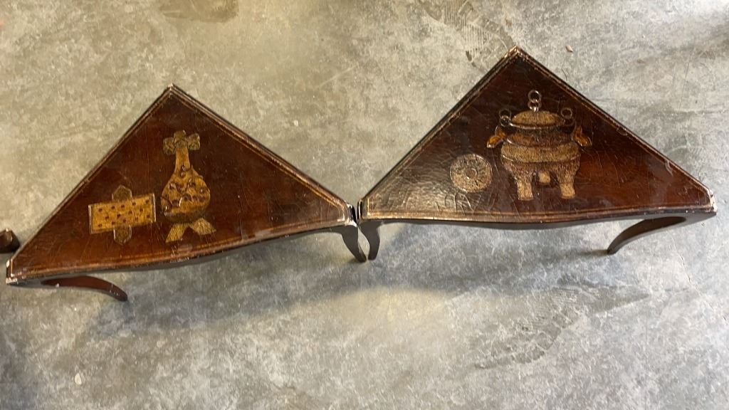 VINTAGE EASTERN TABLE WITH 4 NESTING STOOLS - 2 FOOT X 2 FOOT X 17 INCHES TALL