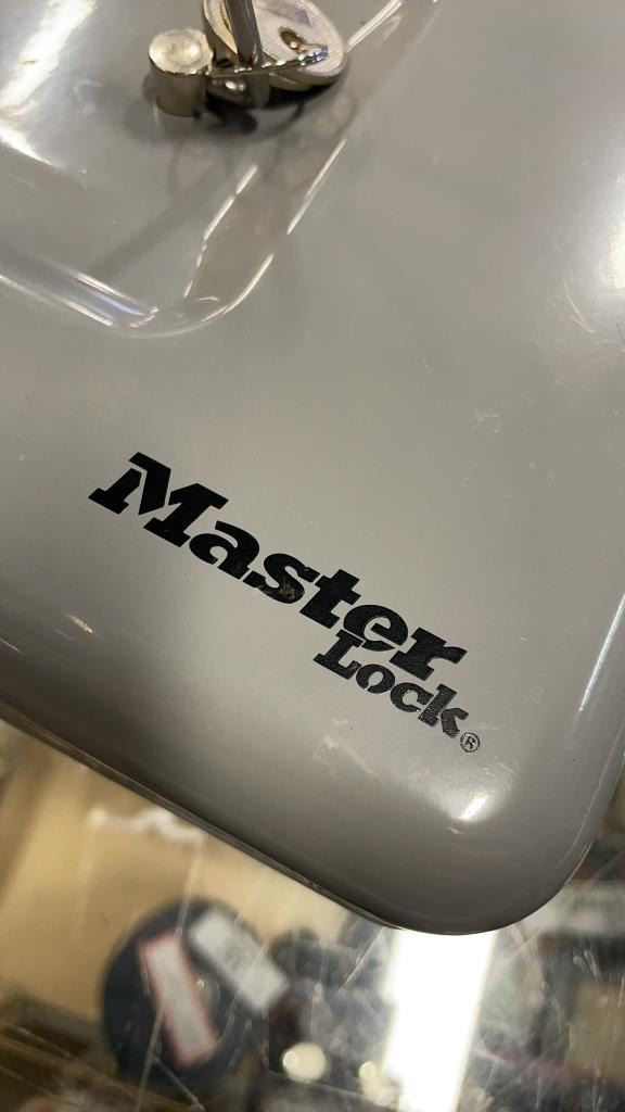 VINTAGE GLASS VASE, TERRA COTTA PLANTER, AND MASSIER METAL CASH LOCK BOX