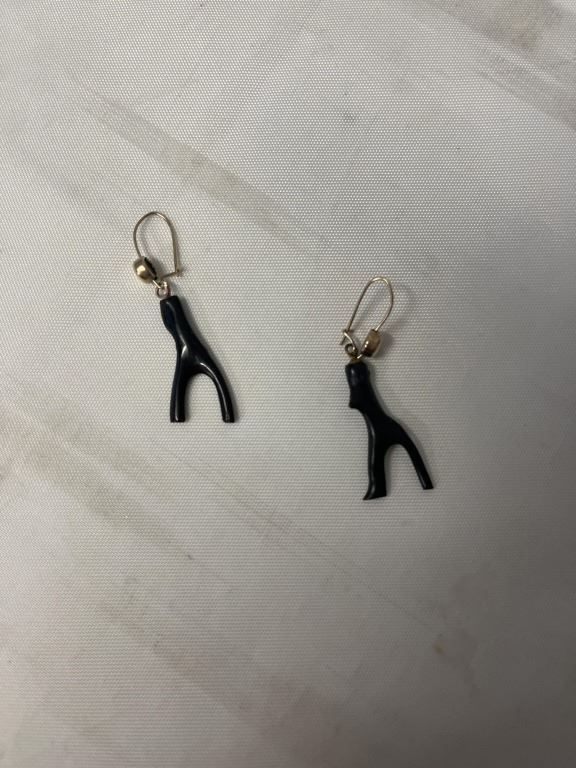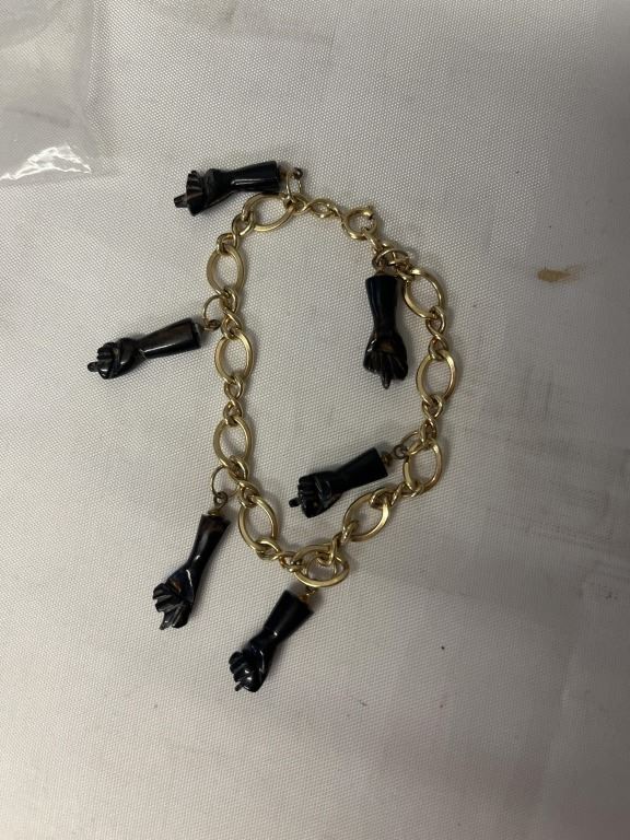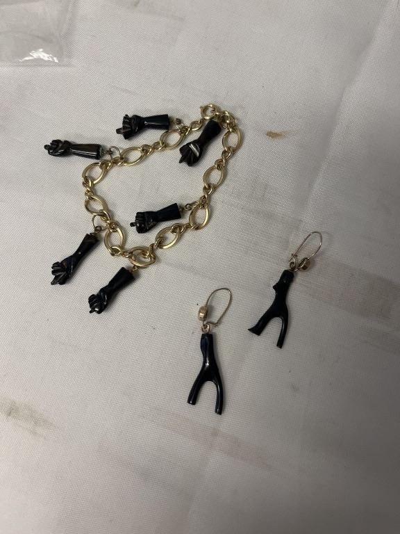 VINTAGE GOLD COLOURED LINKS BRACELET W/ 6 HAND CARVED BLACK CORAL CHARMS AND MATCHING EARRINGS