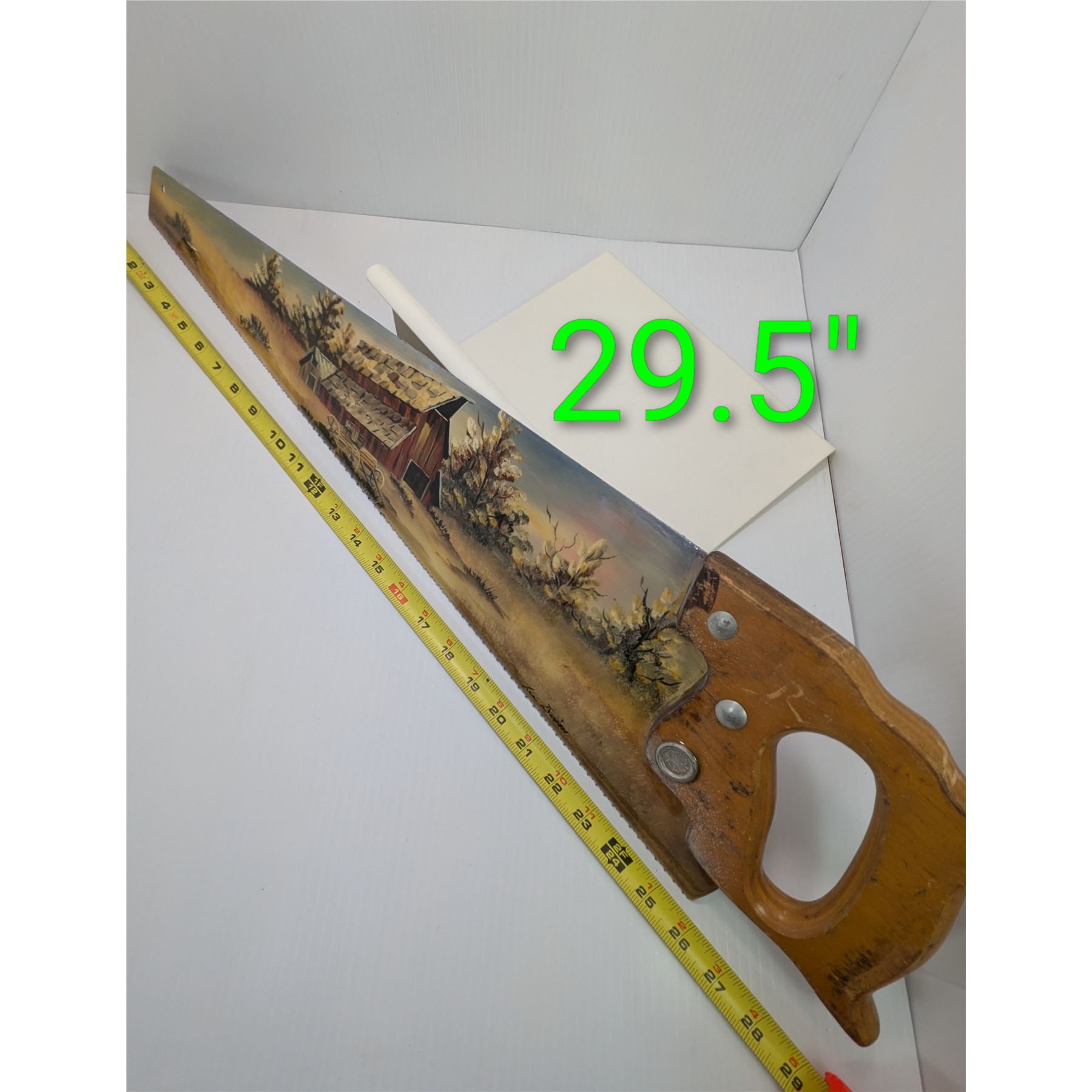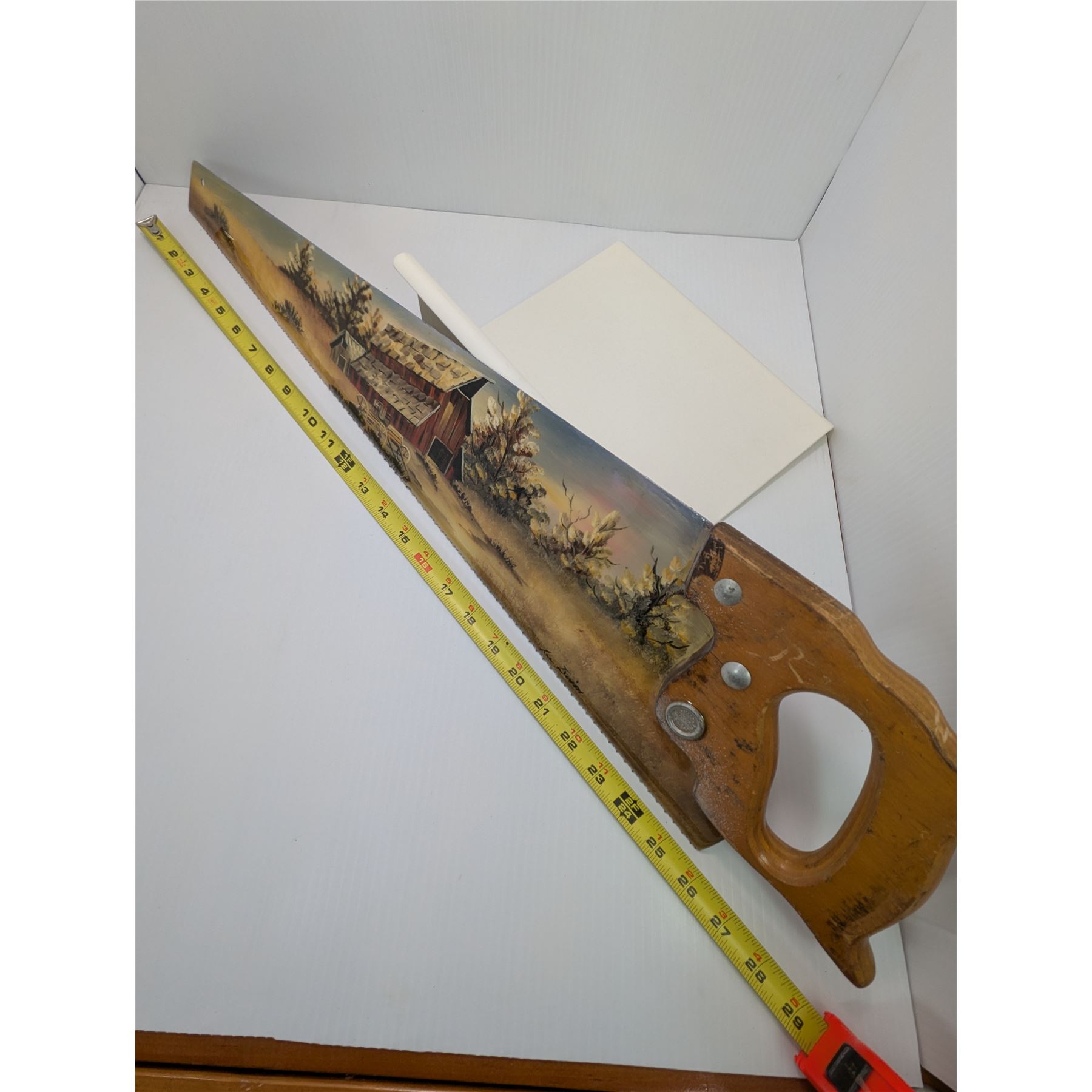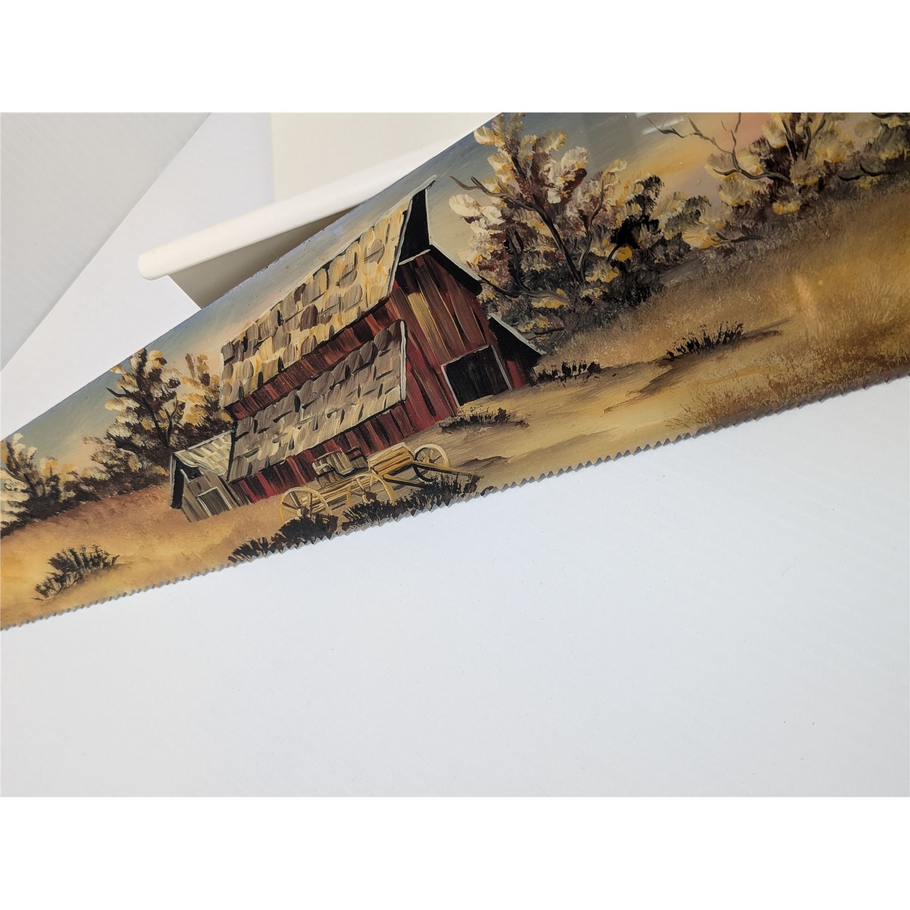 Vintage hand saw painted with a folk art scene. The painting depicts a red barn surrounded by trees and a field.