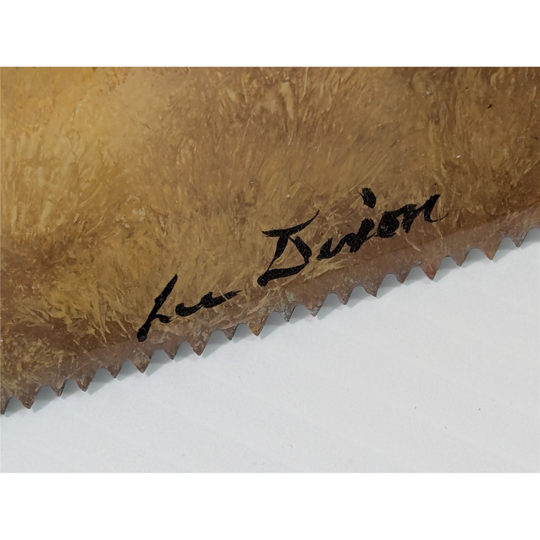 The painting on this saw is signed by the artist, Lee Dexion