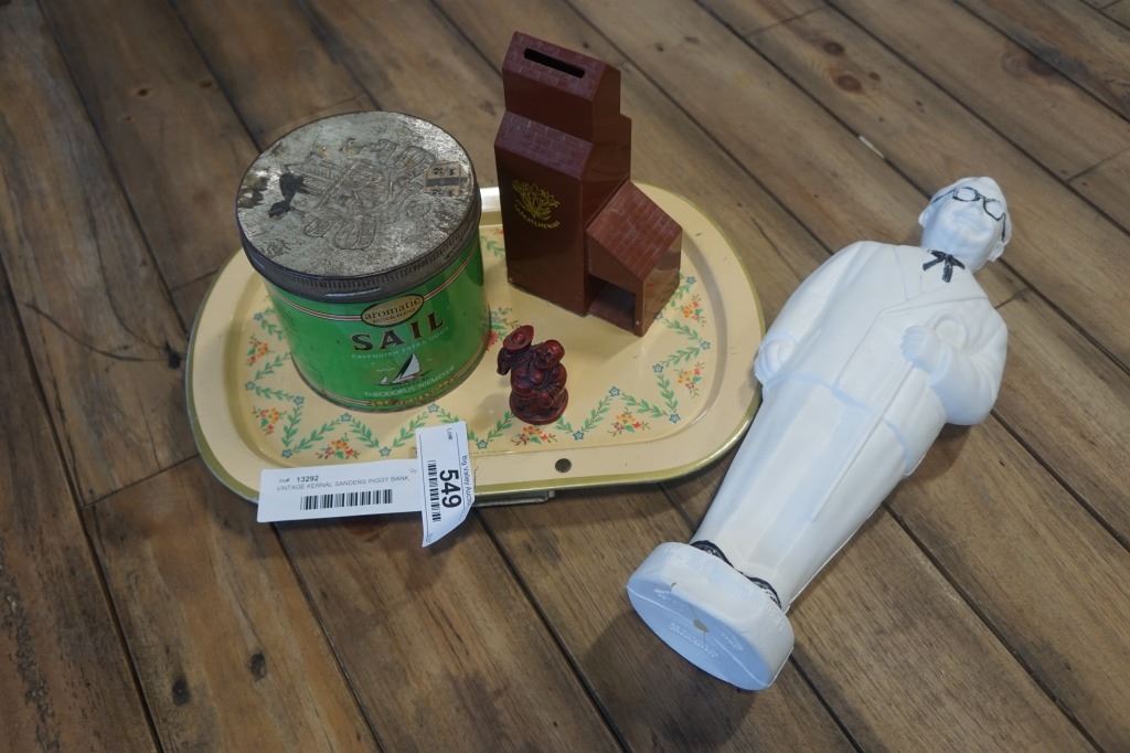 VINTAGE KERNAL SANDERS PIGGY BANK, VINTAGE TIN, TRAY, ETC