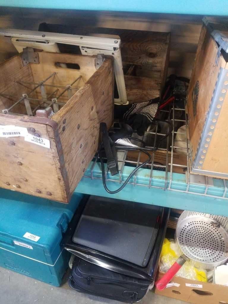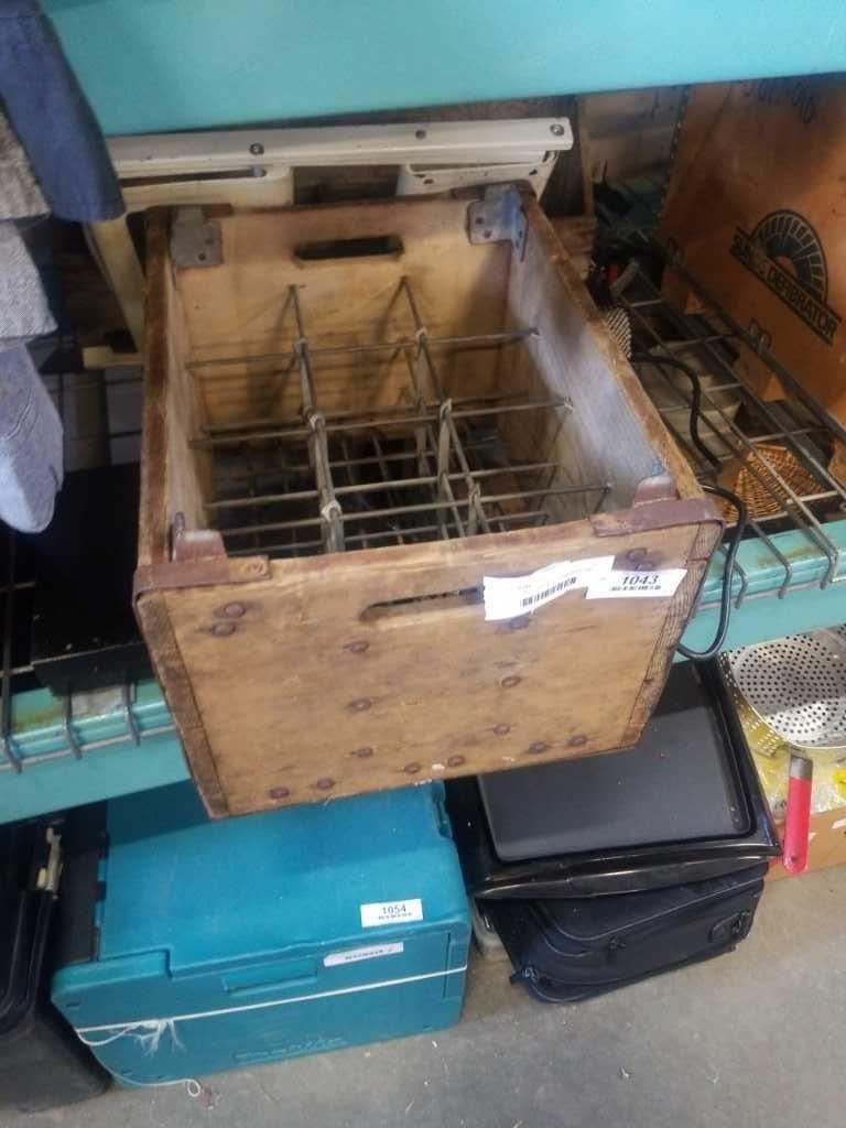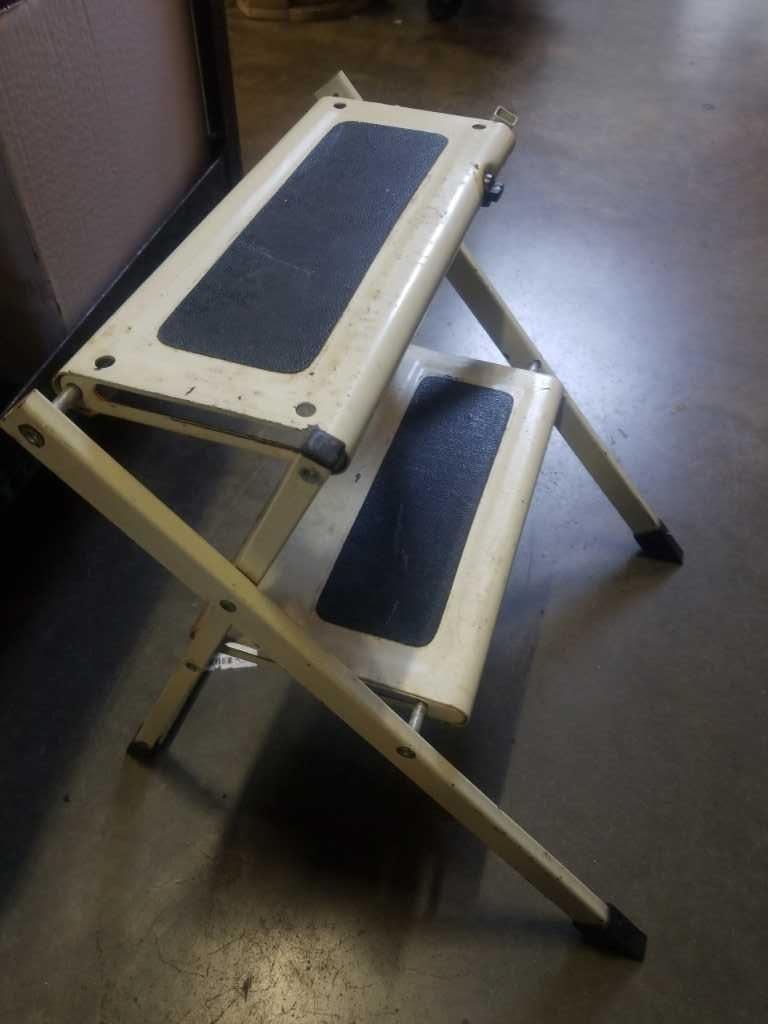 VINTAGE MILK CRATE, FOLDING STEP AND WOOD TOOL TRAY