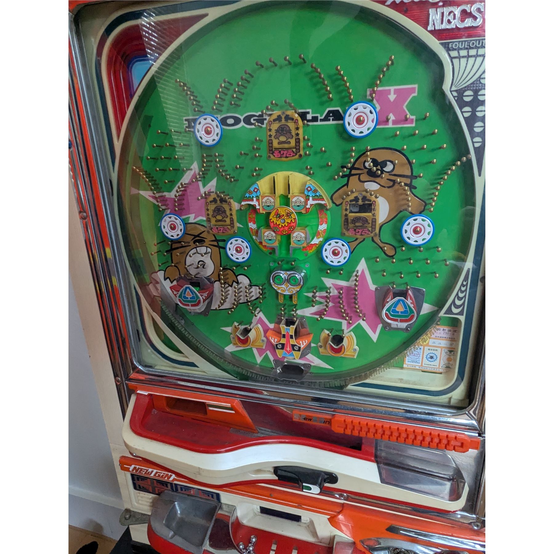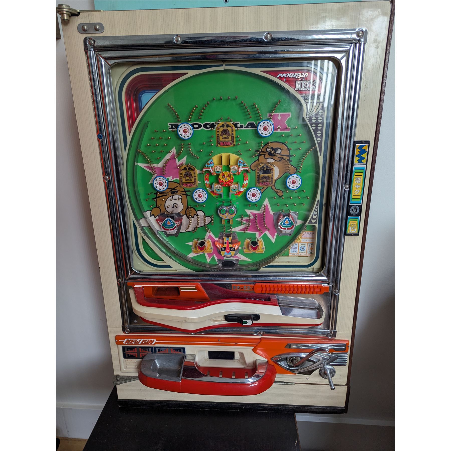 Vintage pachinko machine manufactured by New Gin. Pachinko is a Japanese arcade game similar to a pinball machine, but without flippers.