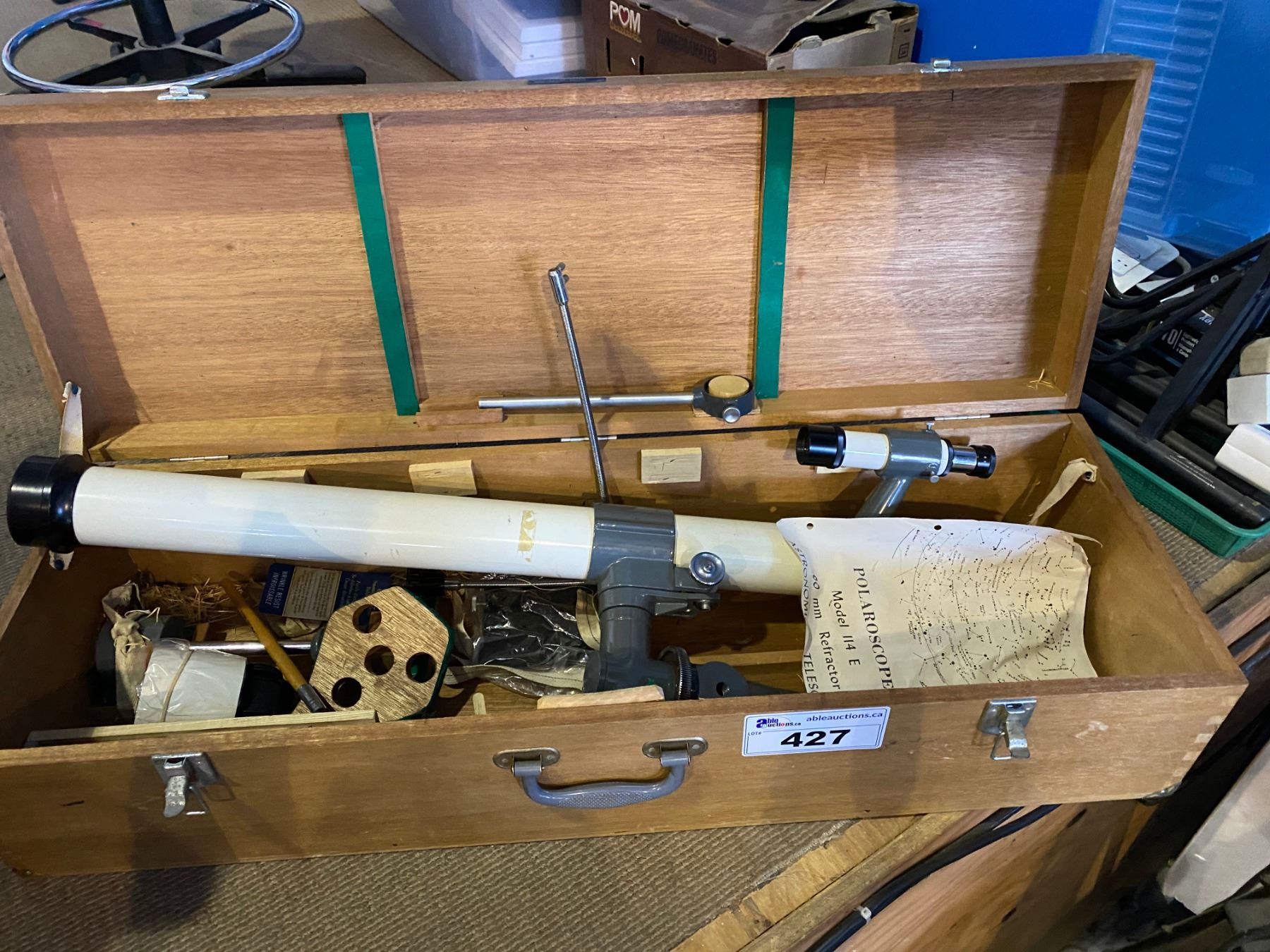 VINTAGE POLARISCOPE D=60MM 1=910MM ZOOM 152X73X45X35X TELESCOPE IN WOODEN CASE MODEL 114E