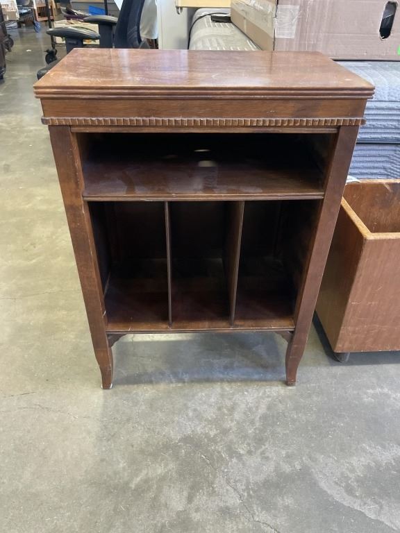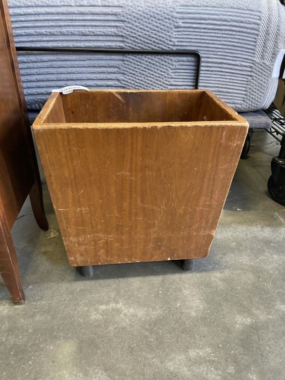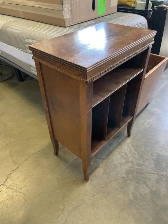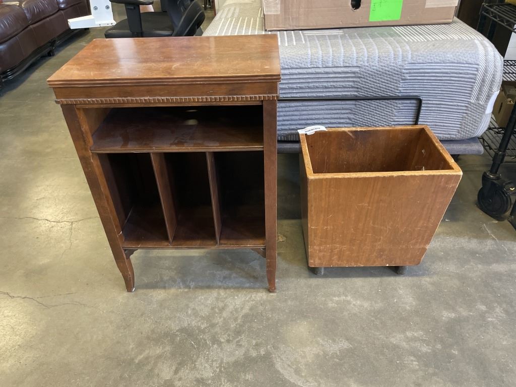 VINTAGE RECORD RACK AND WOOD PLANTER