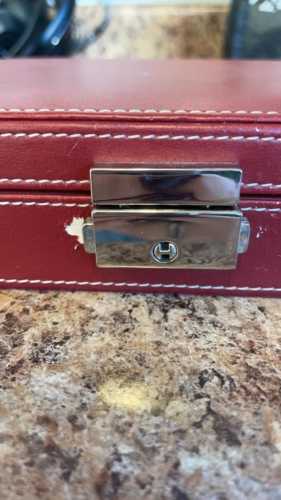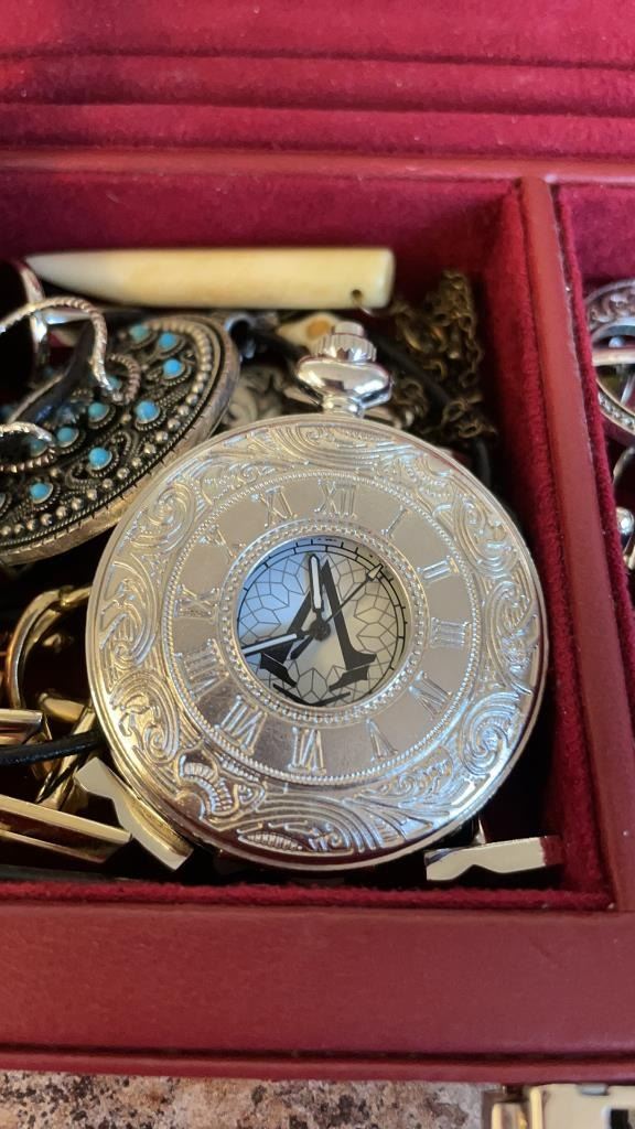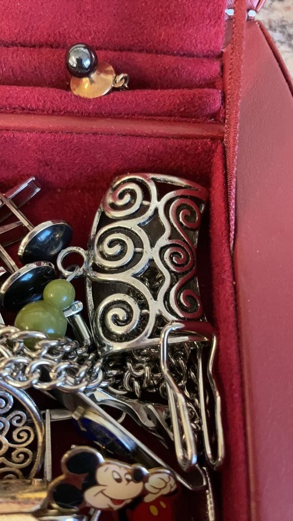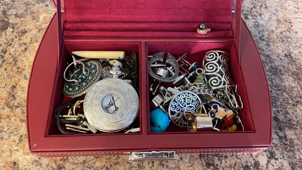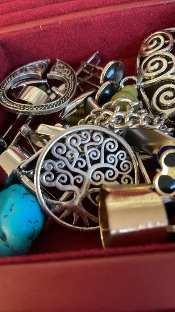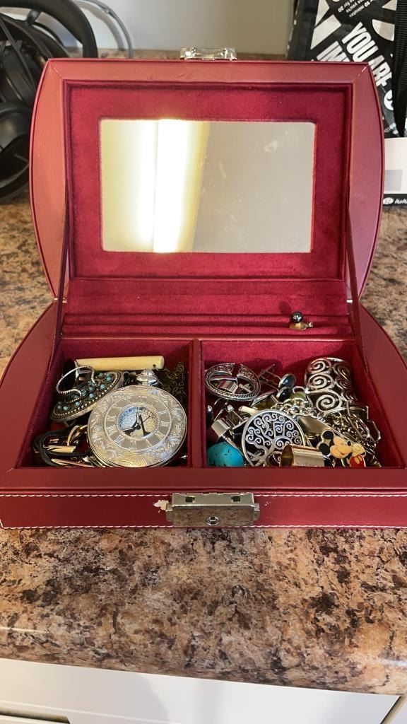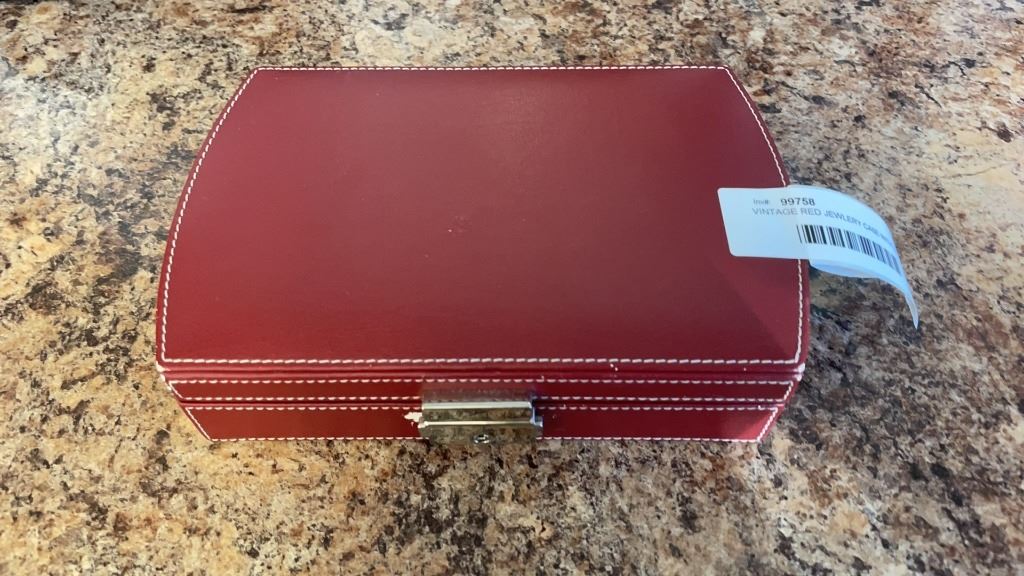 VINTAGE RED JEWLERY CASE WITH LOT OF JEWLERY CONTENTS