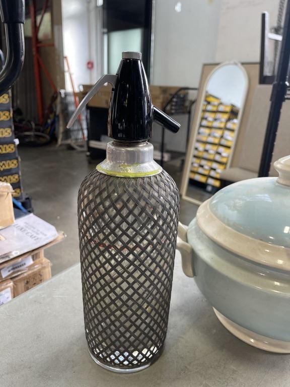 VINTAGE SELTZER BOTTLE AND LIDDED TOUREEN