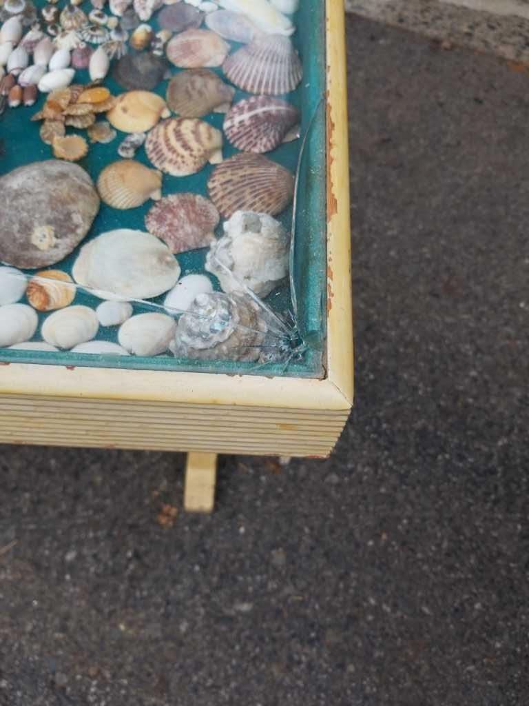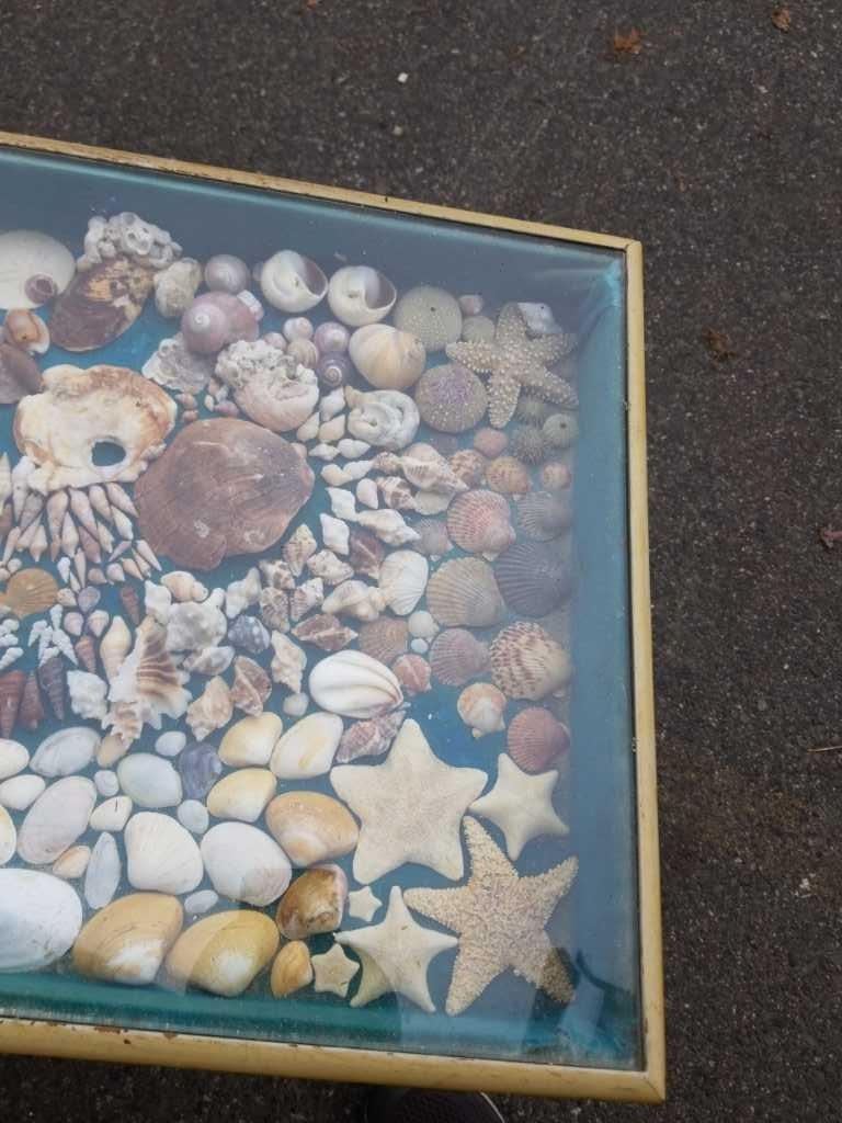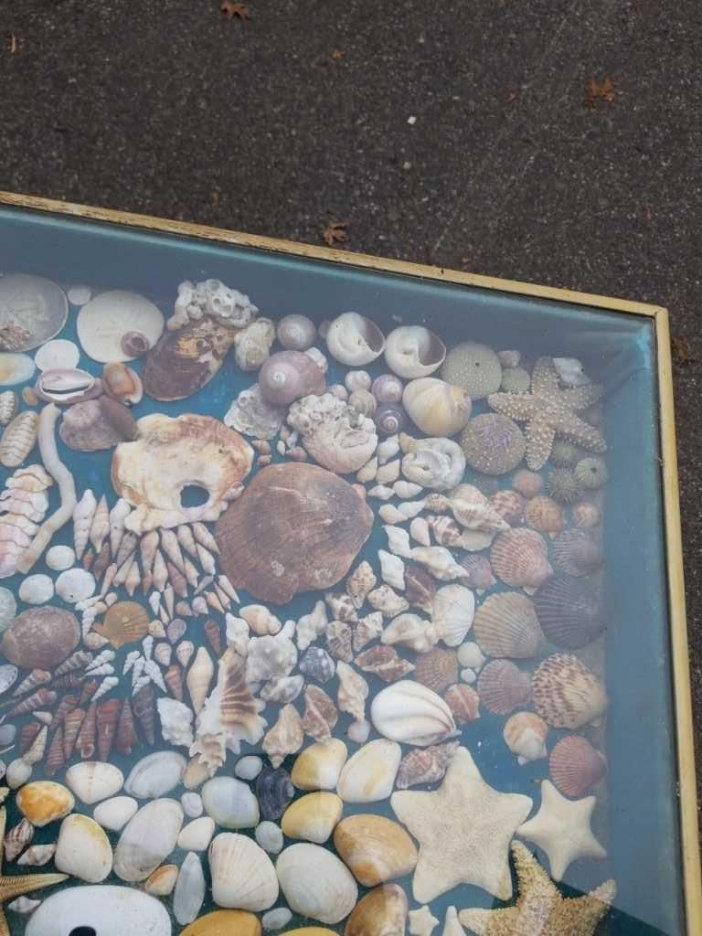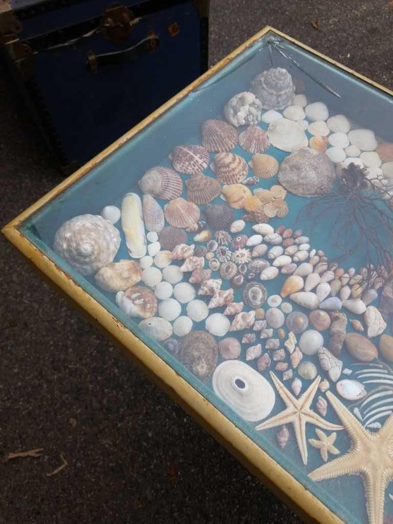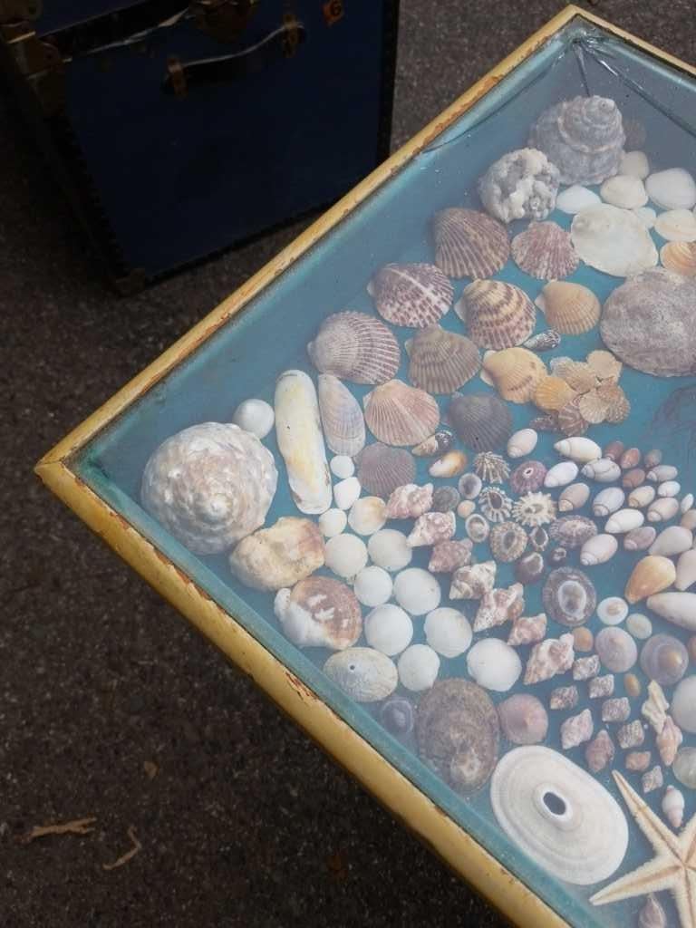 VINTAGE SHADOW BOX HALL TABLE, WITH SHELL DECOR, GLASS NEEDS TO BE REPLACED
