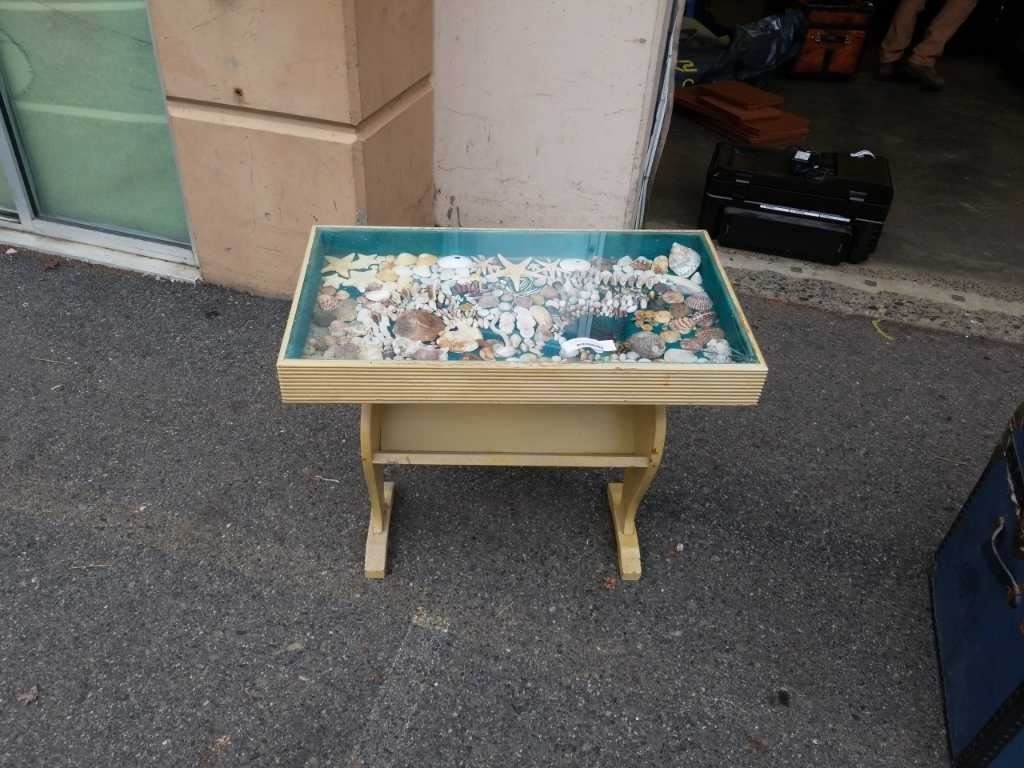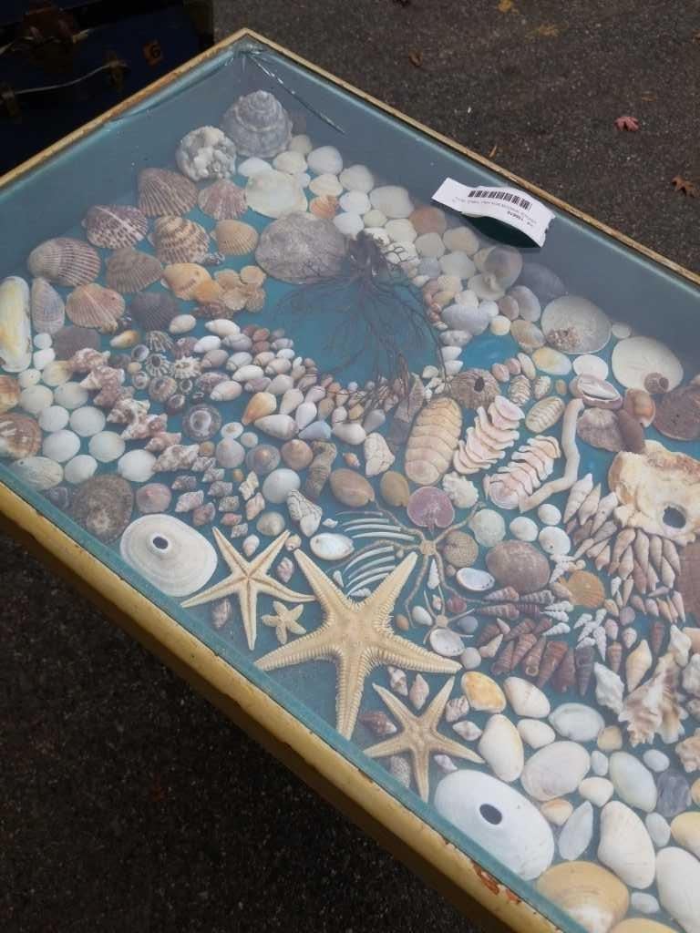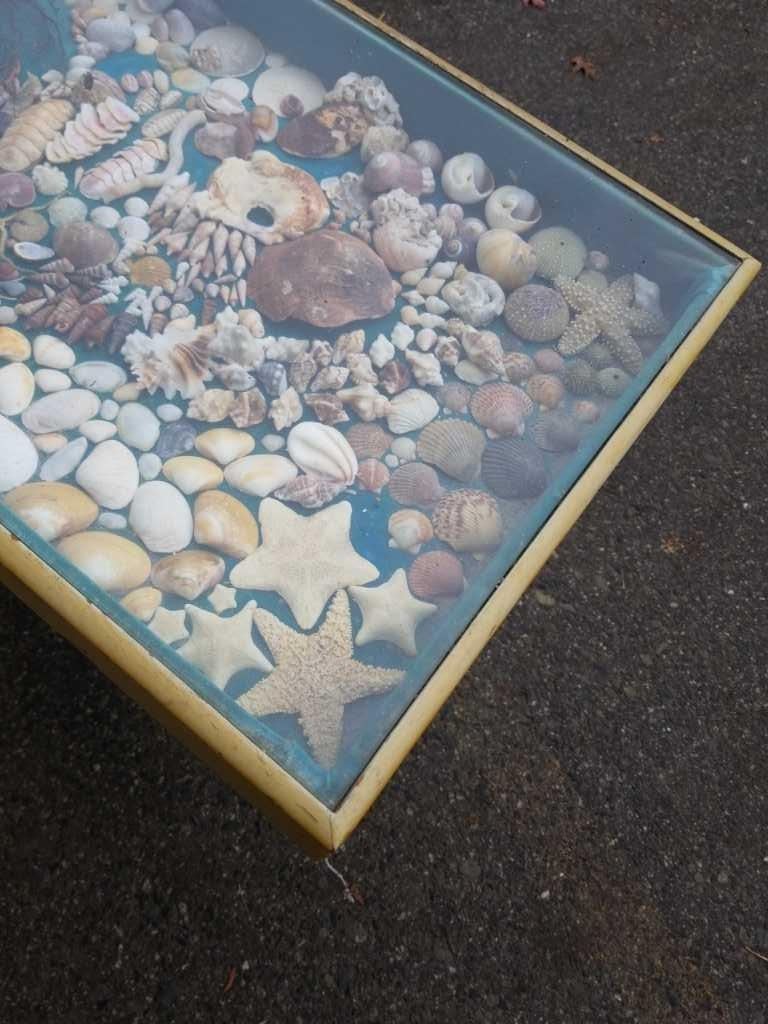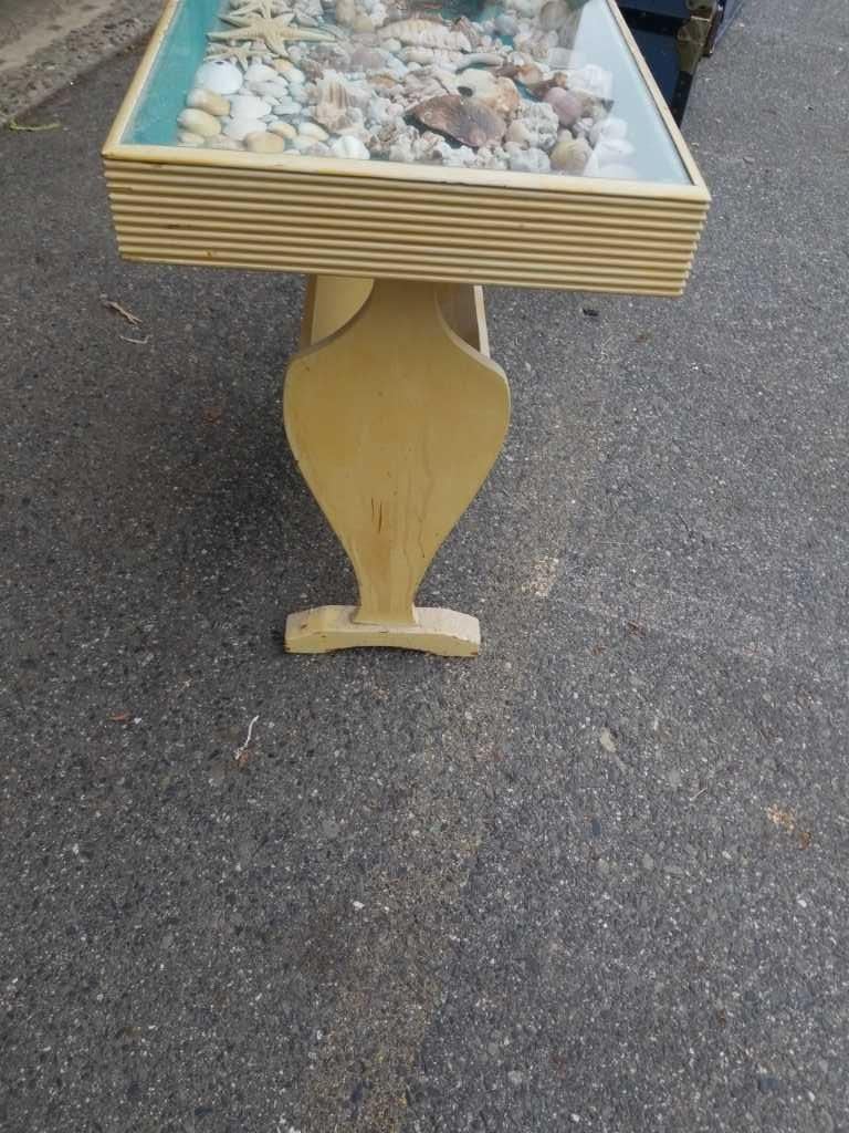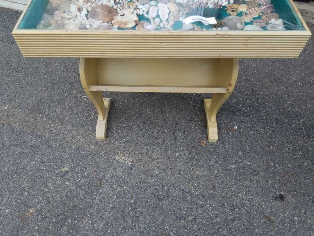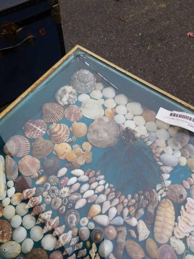 VINTAGE SHADOW BOX HALL TABLE, WITH SHELL DECOR, GLASS NEEDS TO BE REPLACED